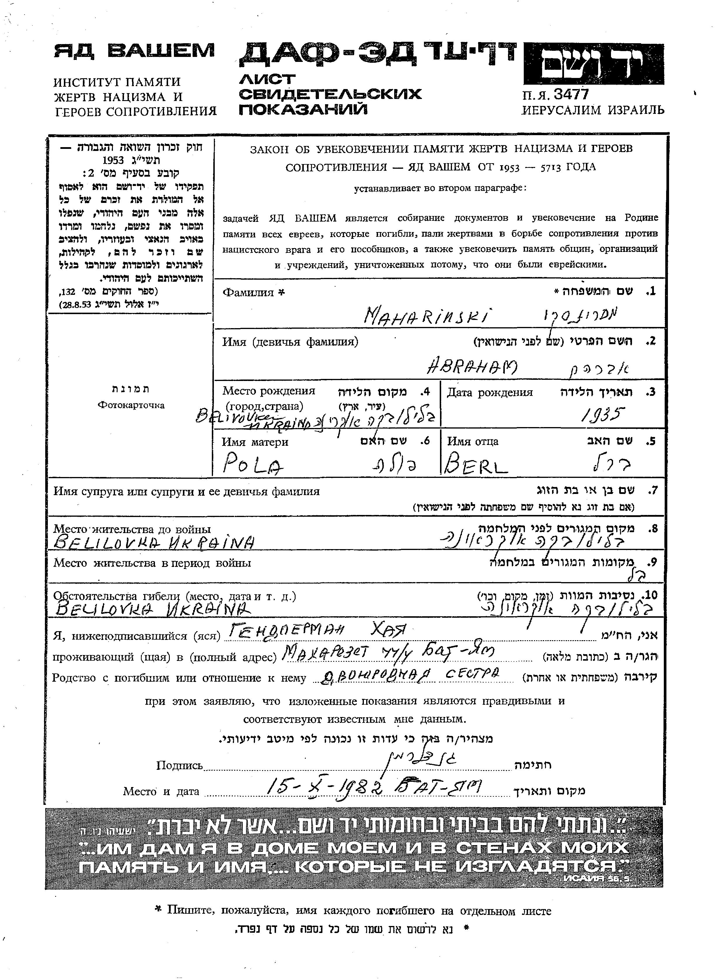 Maharinski Abraham 1935 Belilovka, Ukraine (USSR) Page of Testimony