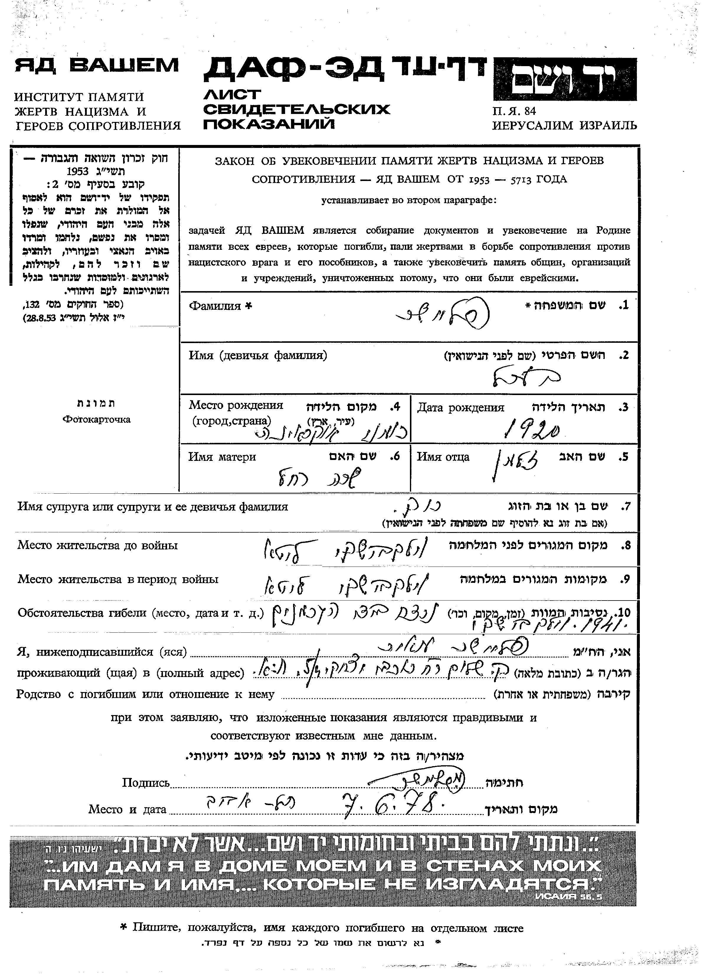 Berl Fleisher was born in Romny, Ukraine (USSR), 1920 to Zalman and Sara Rakhel. He was single. Prior to WWII he lived in Vilkavisk, Lithuania. During the war he was in Vilkavisk, Lithuania. Berl was murdered in the Shoah. Place of death: Vilkavisk, Lithuania, 1941.