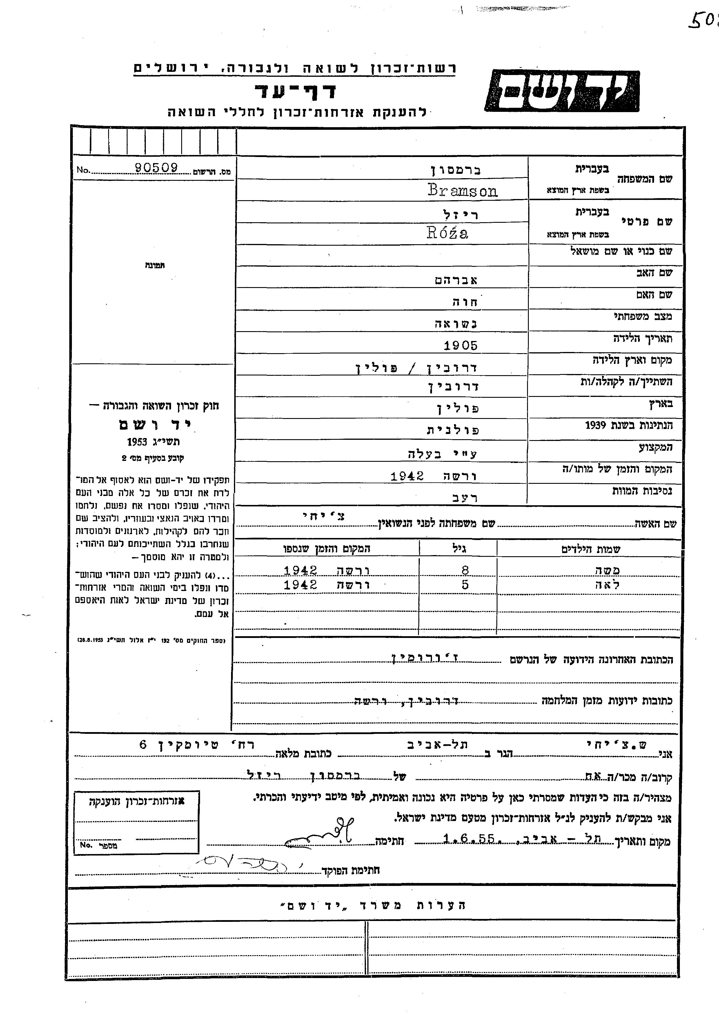 Bramson Reizel 1905 Drobin, Poland Page of Testimony