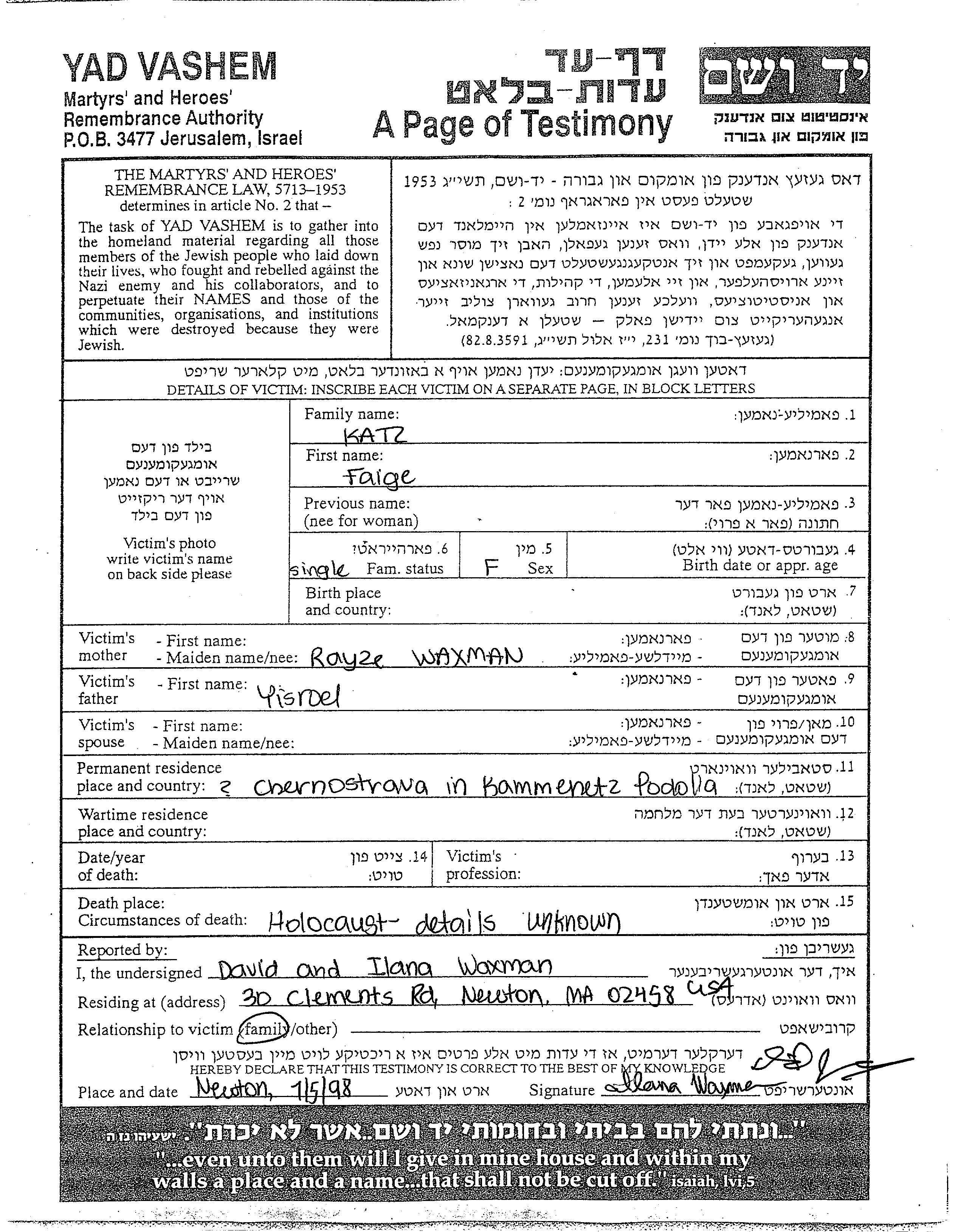 Katz Faige Chernostrava, Ukraine (USSR) Page of Testimony