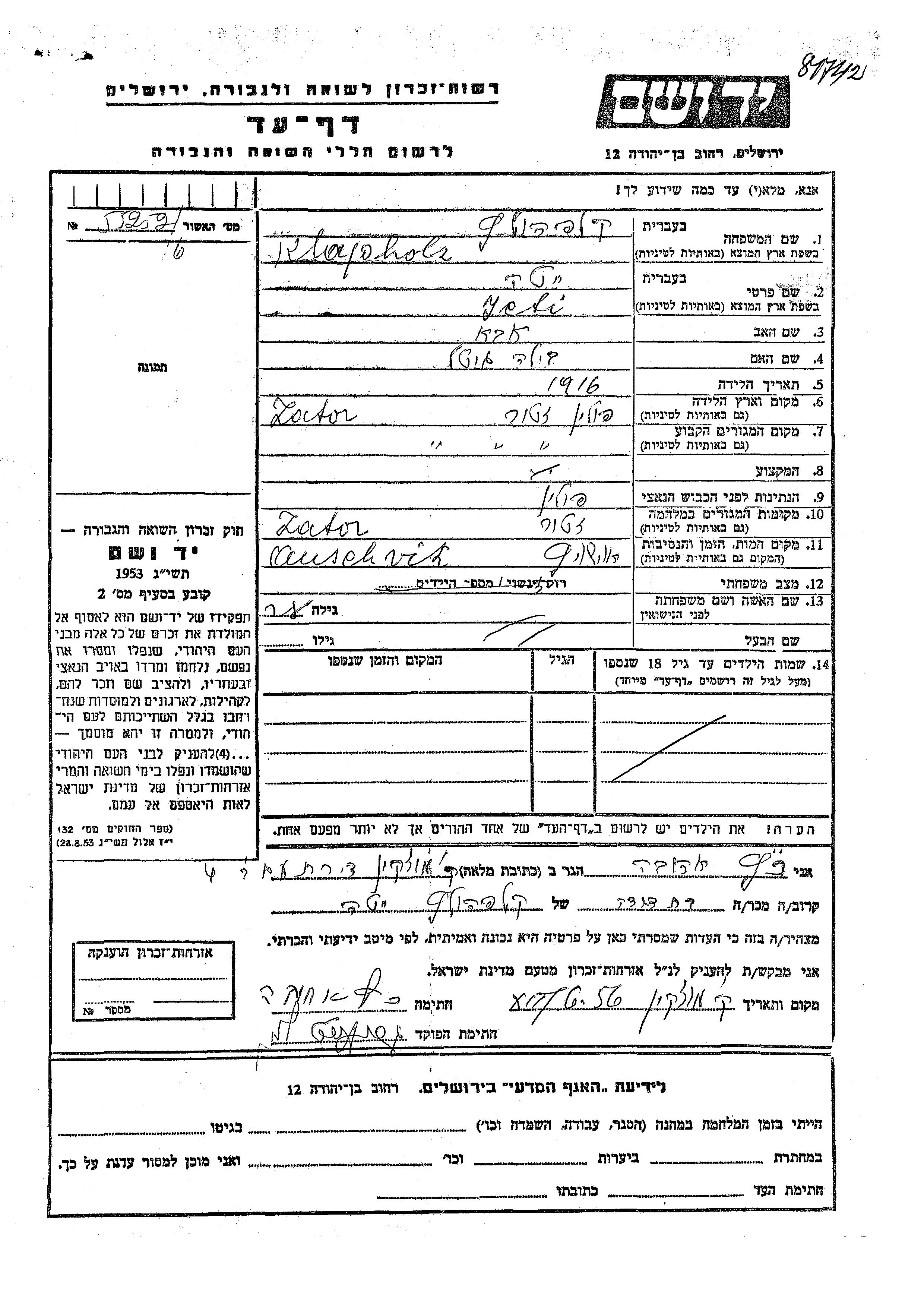 Jeti Klapholz was born in Zator, Poland, 1916 to Aba and Bila Gitel. She was single. Prior to WWII she lived in Zator, Poland. During the war she was in Zator, Poland. Jeti was murdered in the Shoah. Place of death: Auschwitz, Poland.