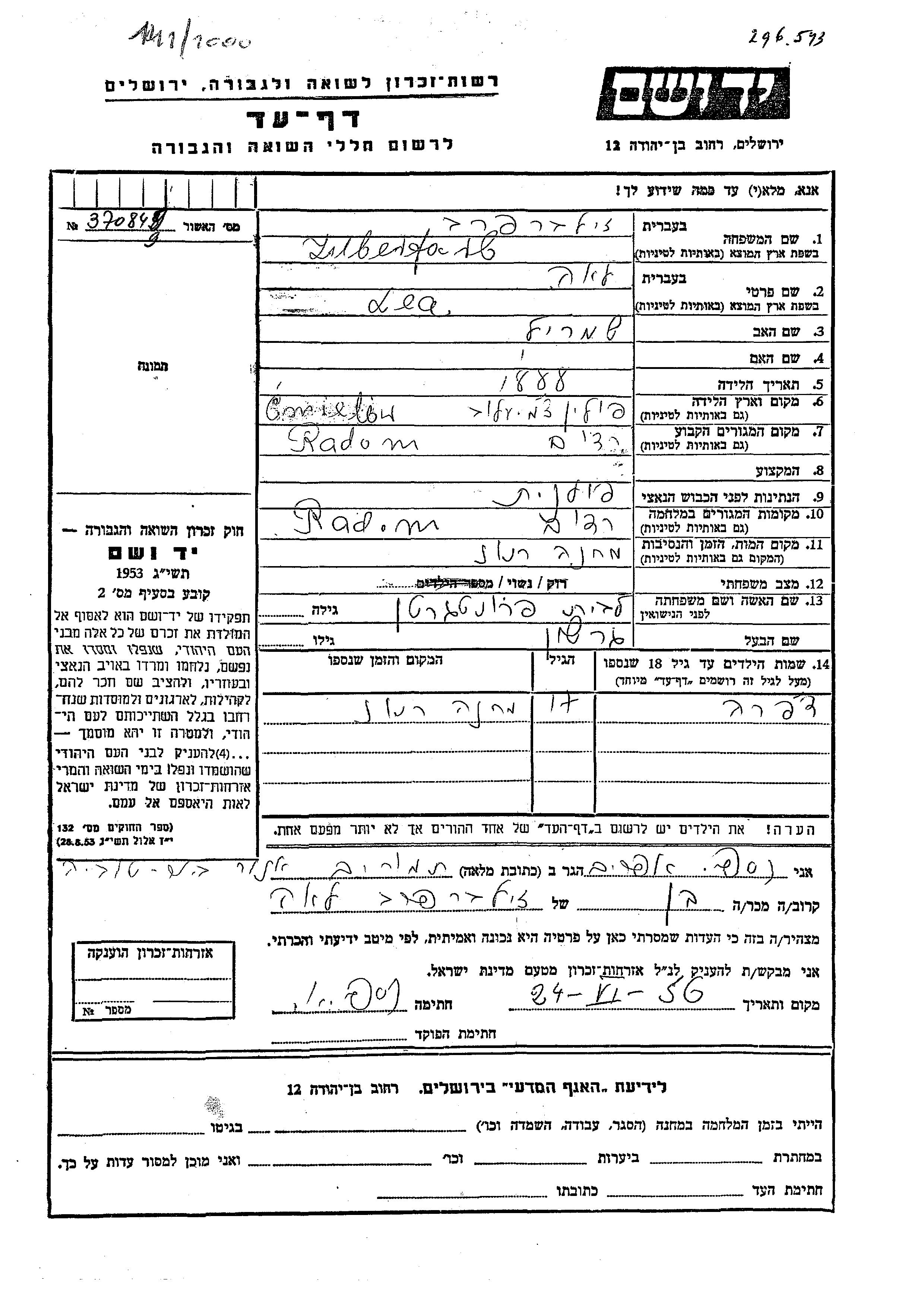 Lea Zilberfarb nee Frukhtgarten was born in Cmielow, Poland, 1888 to Shmeril. She was married to Gershon. Prior to WWII she lived in Radom, Poland. During the war she was in Radom, Poland. Lea was murdered in the Shoah.