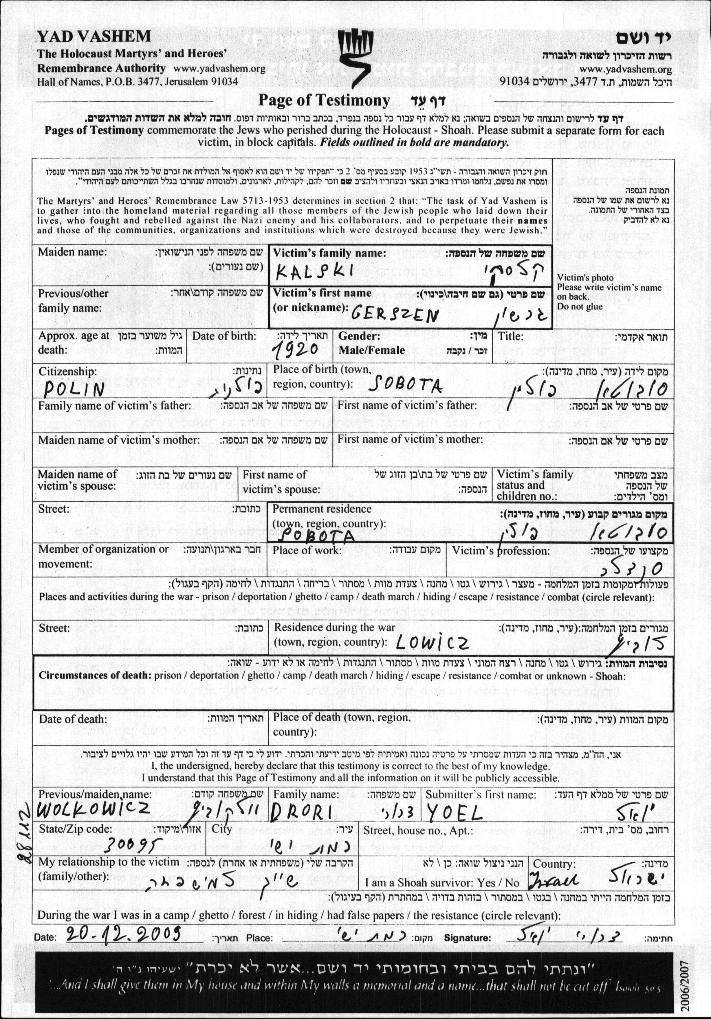 Gerszen Kalski was born in Sobota, Poland, 1920. He was a shoemaker. Prior to WWII he lived in Sobota, Poland. During the war he was in Lowicz, Poland. Gerszen was murdered in the Shoah.