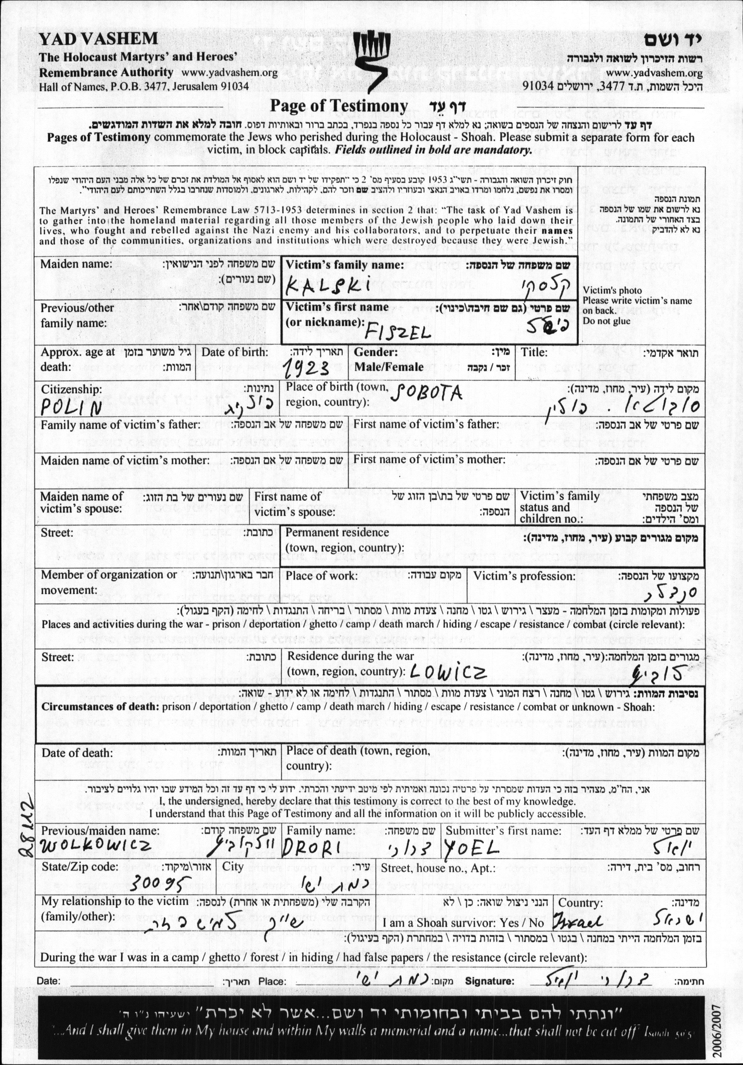 Kalski Fiszel 1923 Poland Page of Testimony