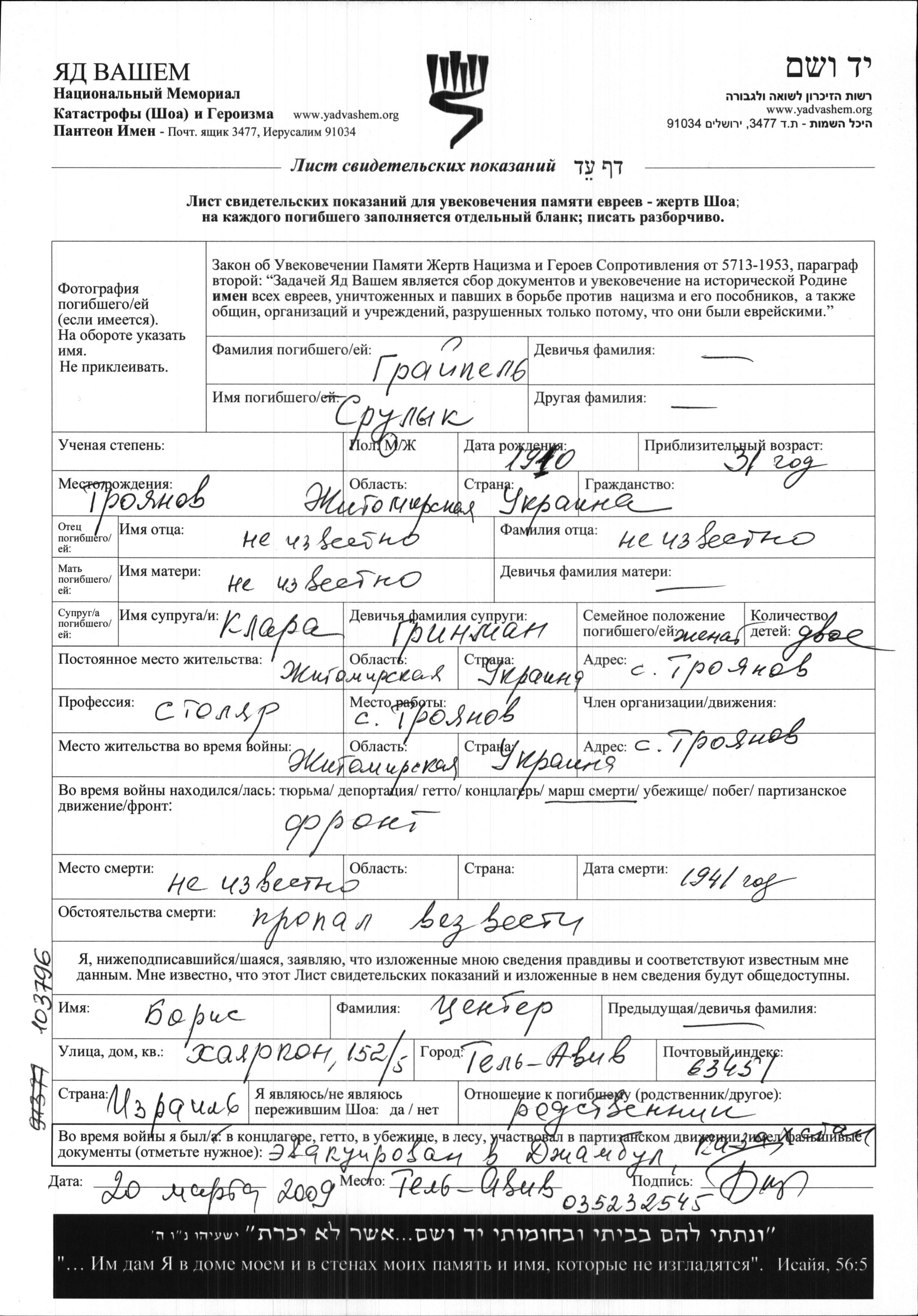 Srulyk Graipel was born in Troyanov, Ukraine (USSR), 1910. He was a cabinet maker and married to Klara nee Grinman. Prior to WWII he lived in Troyanov, Ukraine (USSR). During the war he was in the Soviet armed forces. Srulyk was murdered in the Shoah. Place of death: unknown, 1941.