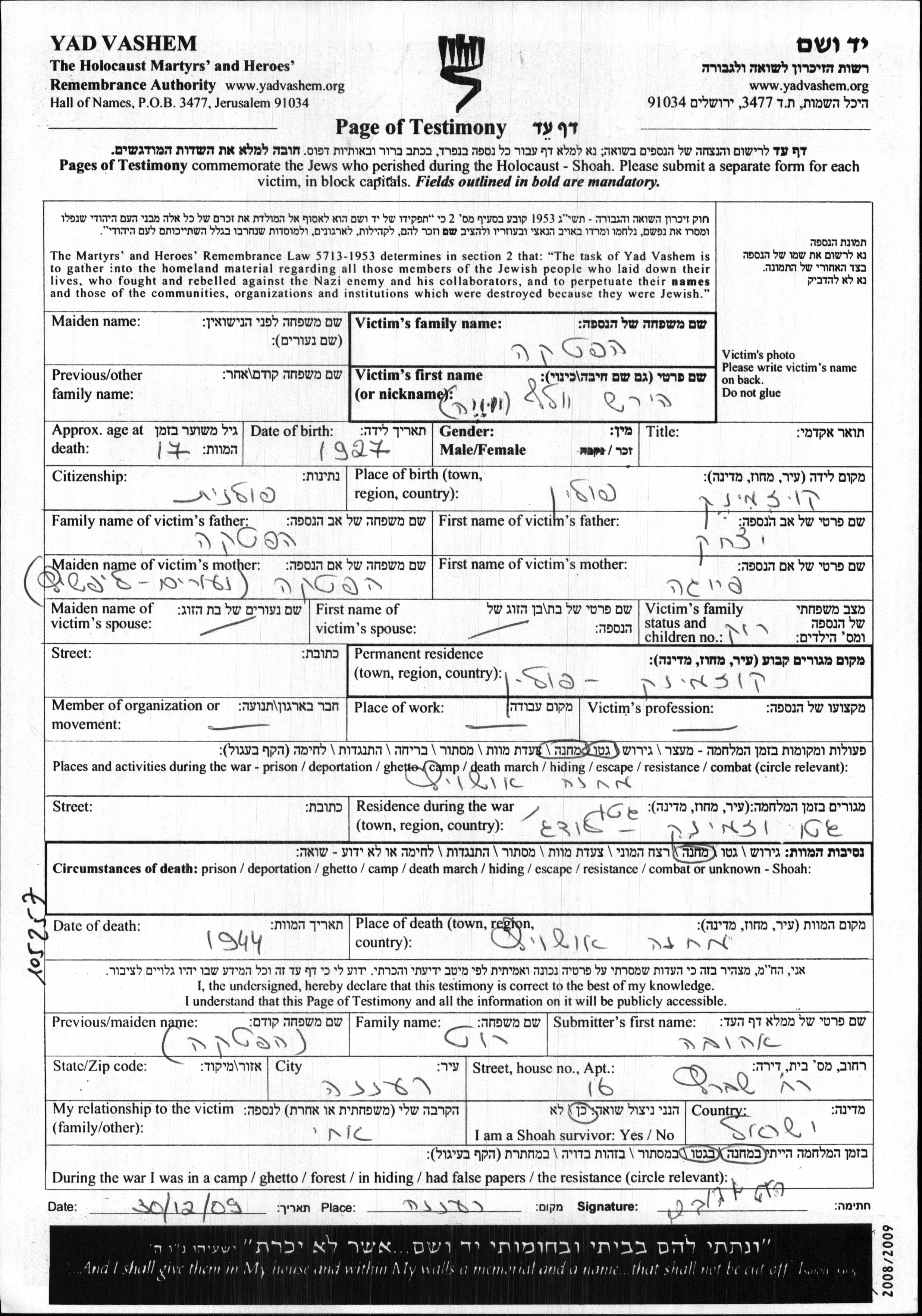 Hirsh Volf Haftke was born in Kozminek, Poland, 1927 to Yitzkhak and Feiga nee Lipshitz. He was child. Prior to WWII he lived in Kozminek, Poland. During the war he was in Kozminek, Poland. Hirsh Volf was murdered in the Shoah. Place of death: Auschwitz, Poland, 1944.
