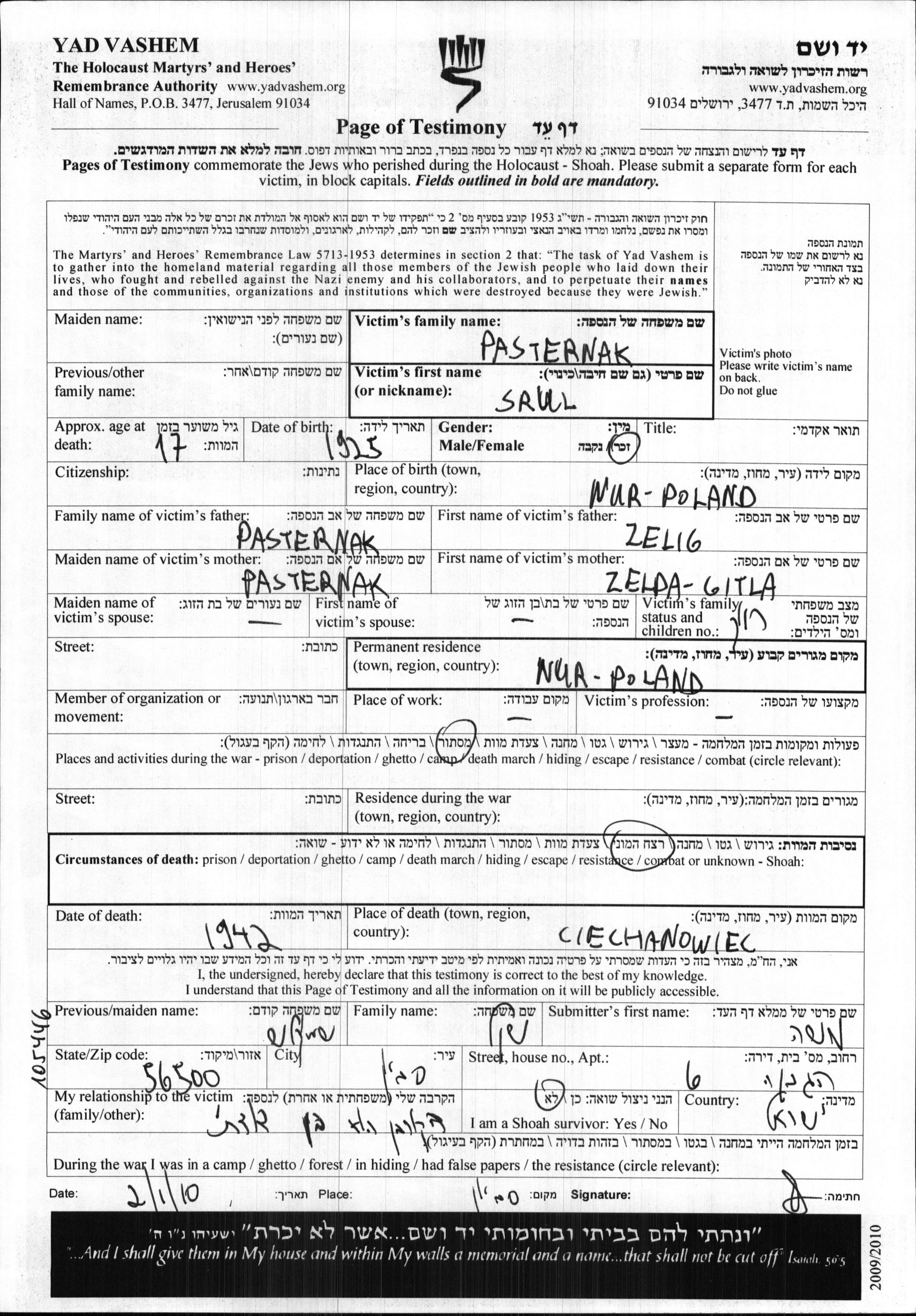 Srul Pasternak was born in Nur, Poland, 1925 to Zelig and Zelda Gitla. He was teenager. Prior to WWII he lived in Nur, Poland. Srul was murdered in the Shoah. Place of death: Ciechanowiec, Poland, 1942.