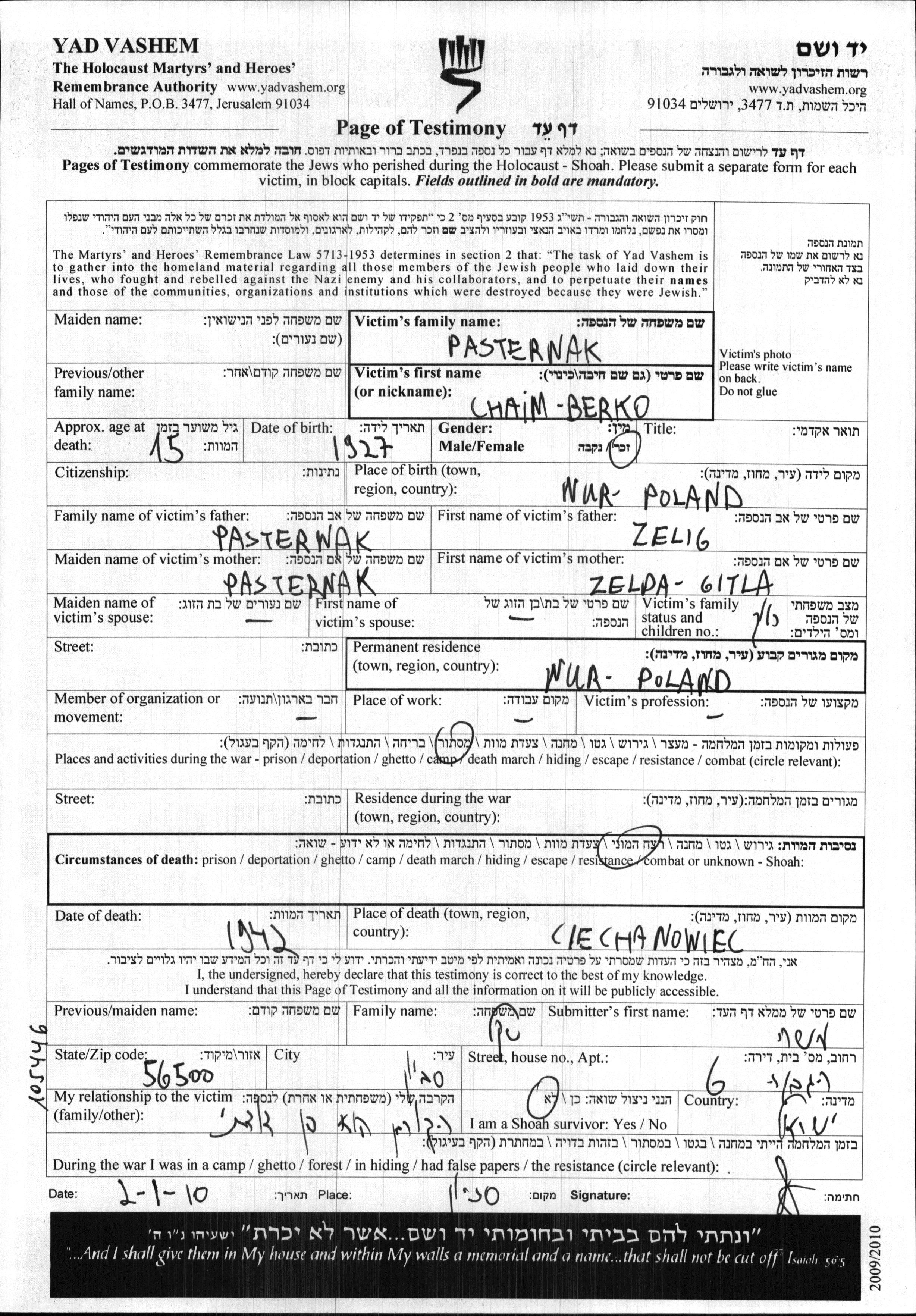 Chaim Berko Pasternak was born in Nur, Poland, 1927 to Zelig and Zelda Gitla. He was teenager. Prior to WWII he lived in Nur, Poland. Chaim Berko was murdered in the Shoah. Place of death: Ciechanowiec, Poland, 1942.
