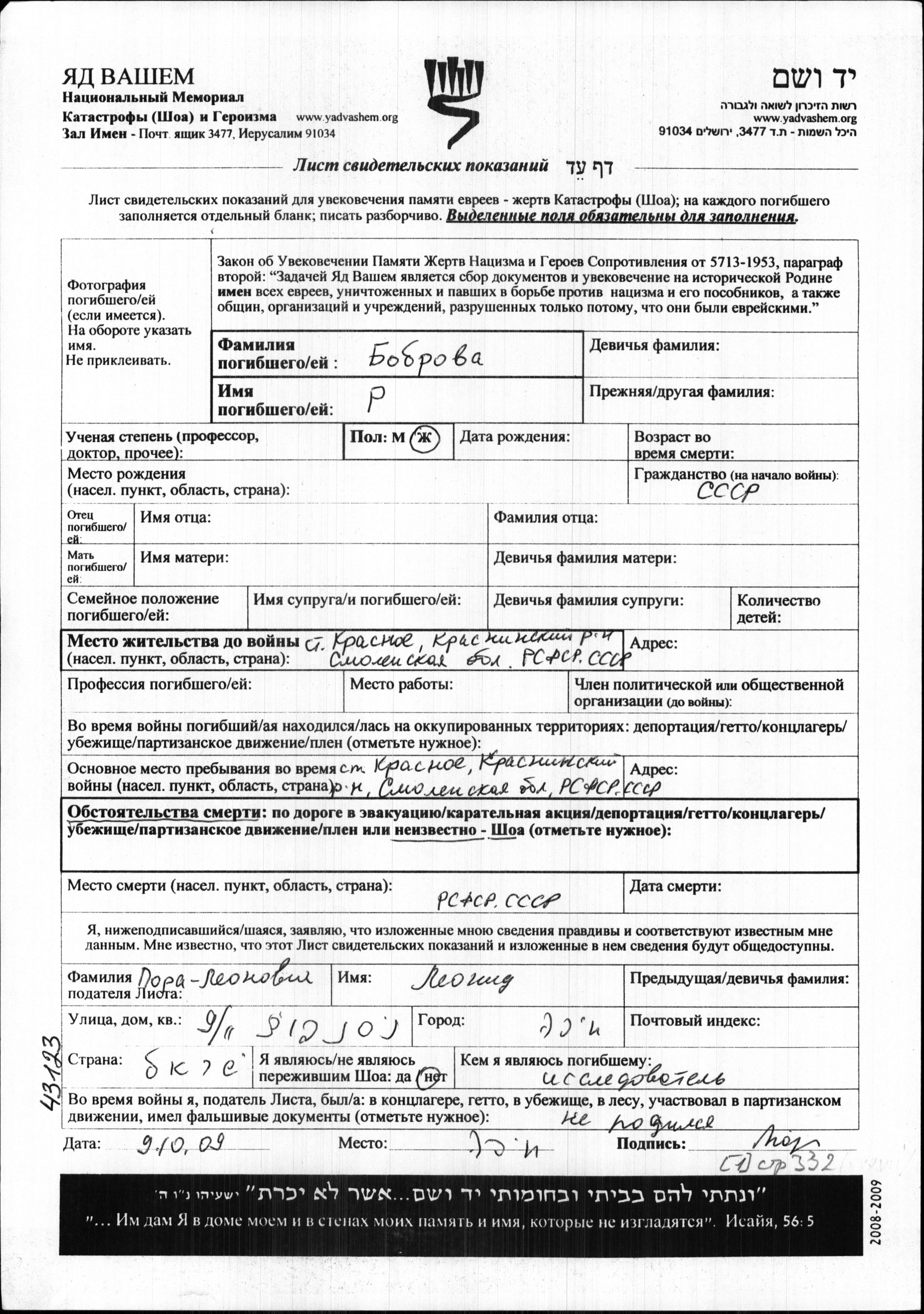 Bobrova R Krasnoye, Russia (USSR) Page of Testimony