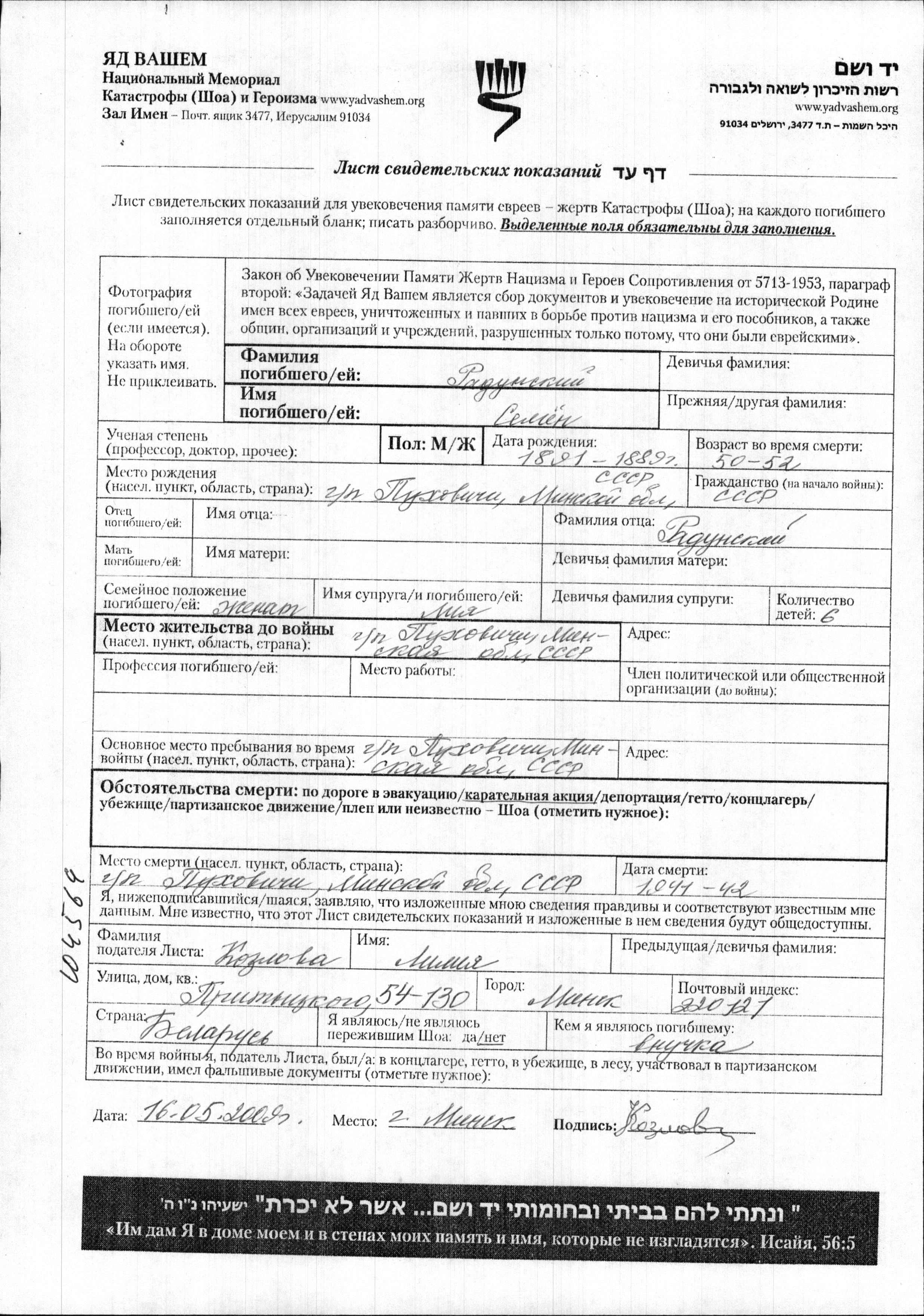 Radunski Semyon 1891 Pukhovichi, Belorussia (USSR) Page of Testimony