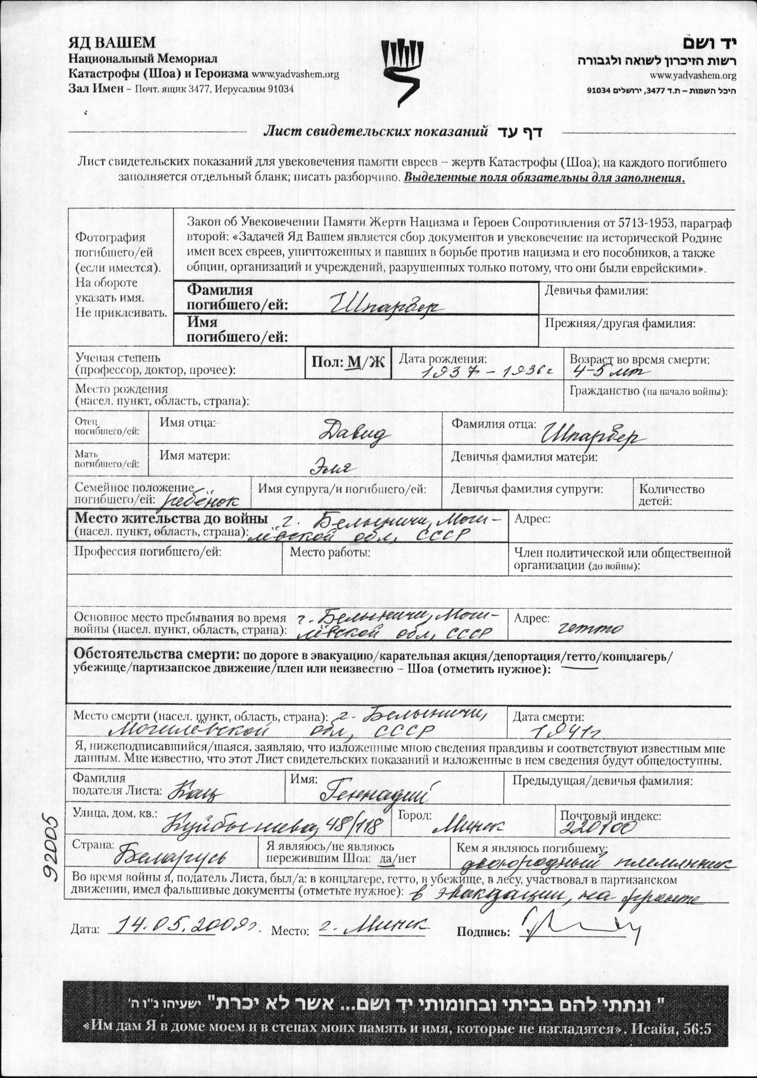 Shparber First name unknown 1937 Belynichi, Belorussia (USSR) Page of Testimony