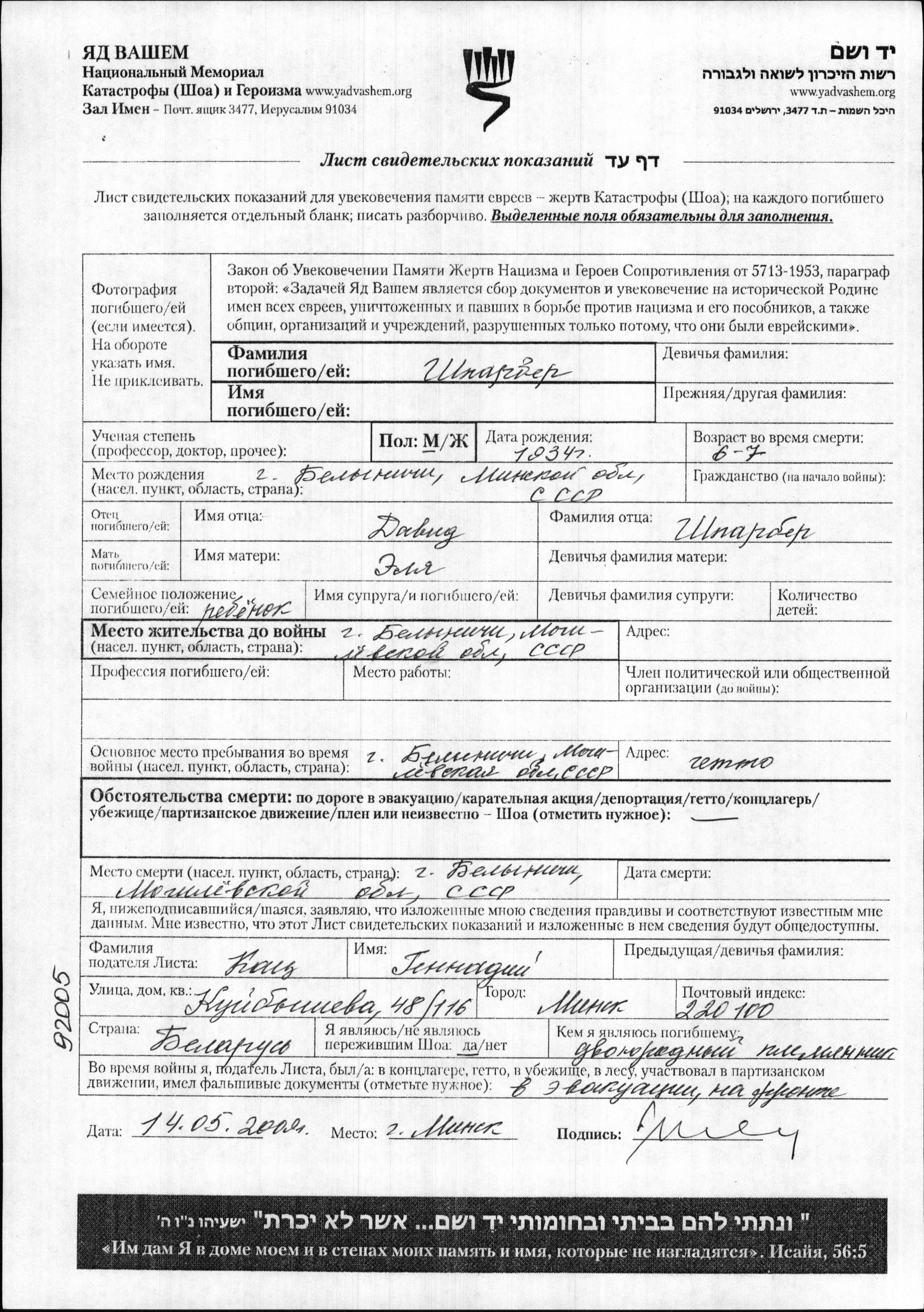 Shparber First name unknown 1934 Belynichi, Belorussia (USSR) Page of Testimony