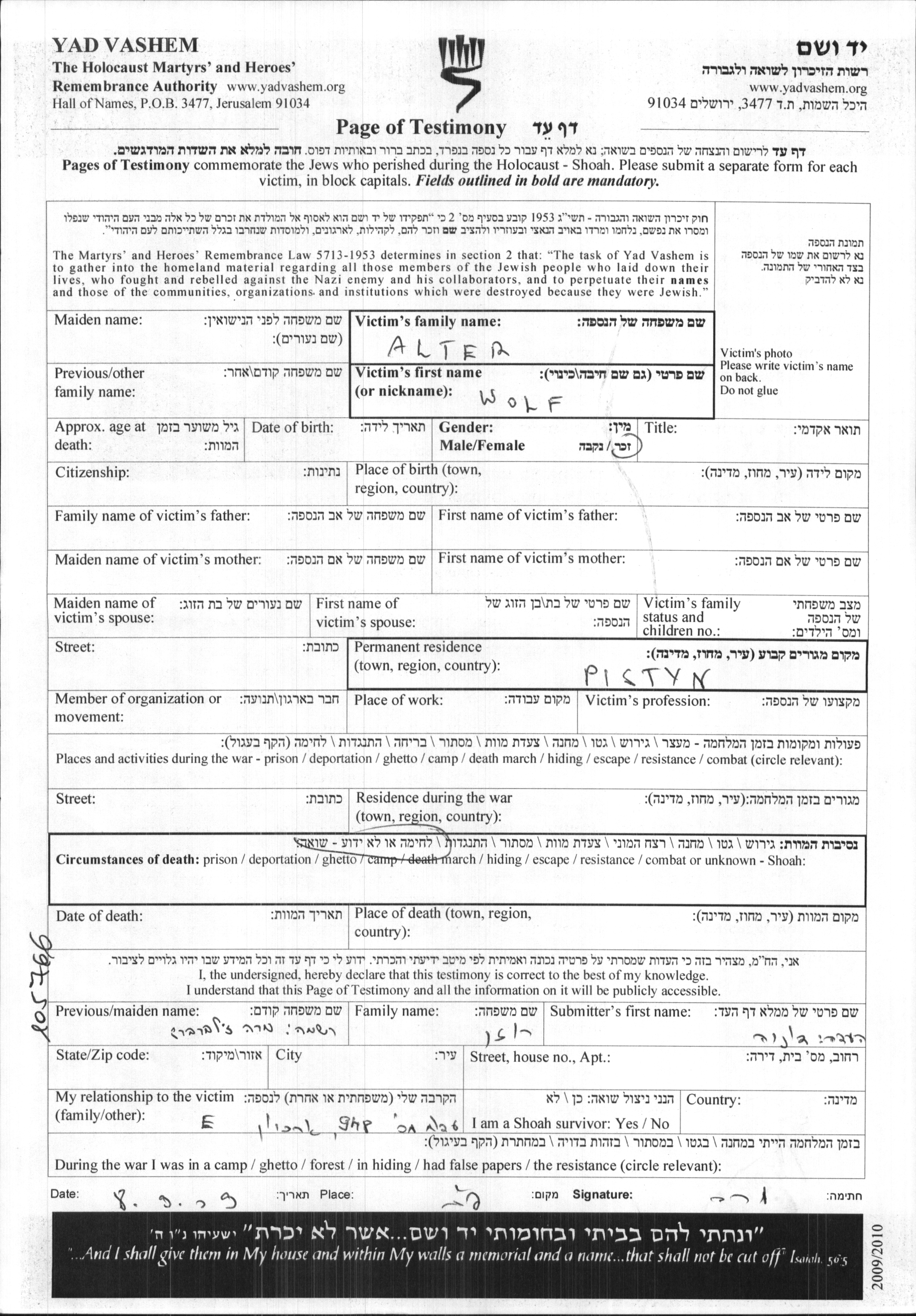 Wolf Alter. Prior to WWII he lived in Pistyń, Poland.