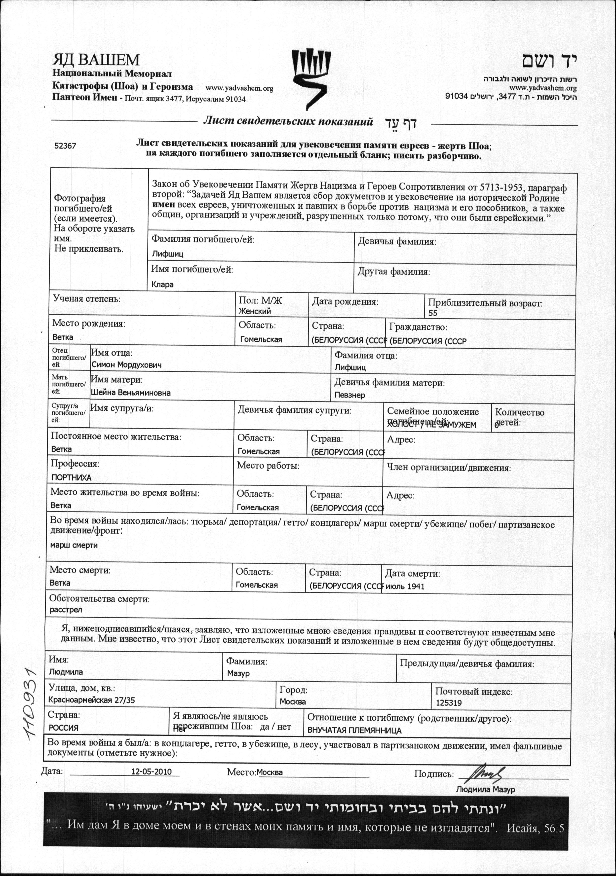 Livshitz Klara Vetka, Belorussia (USSR) Page of Testimony (digital signed)