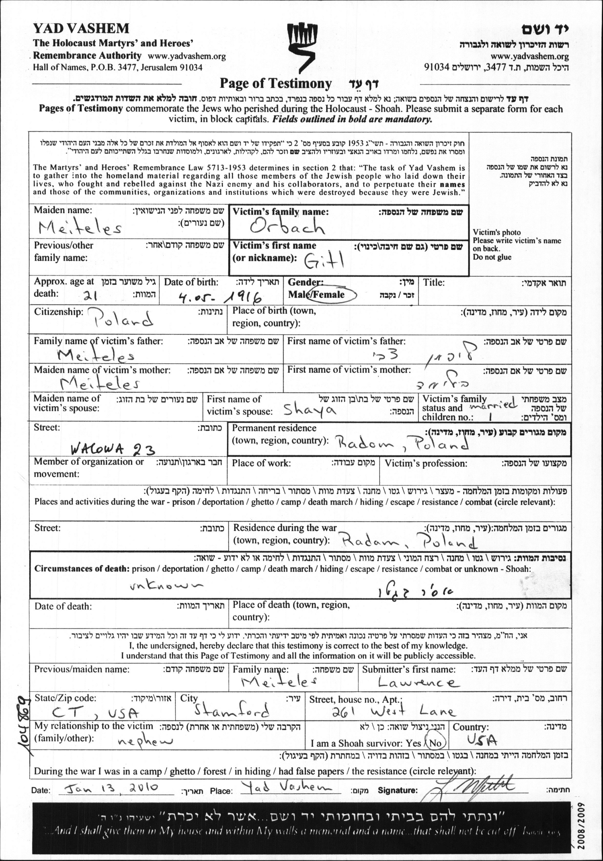 Orbach Gitl 1916 Radom, Poland Page of Testimony