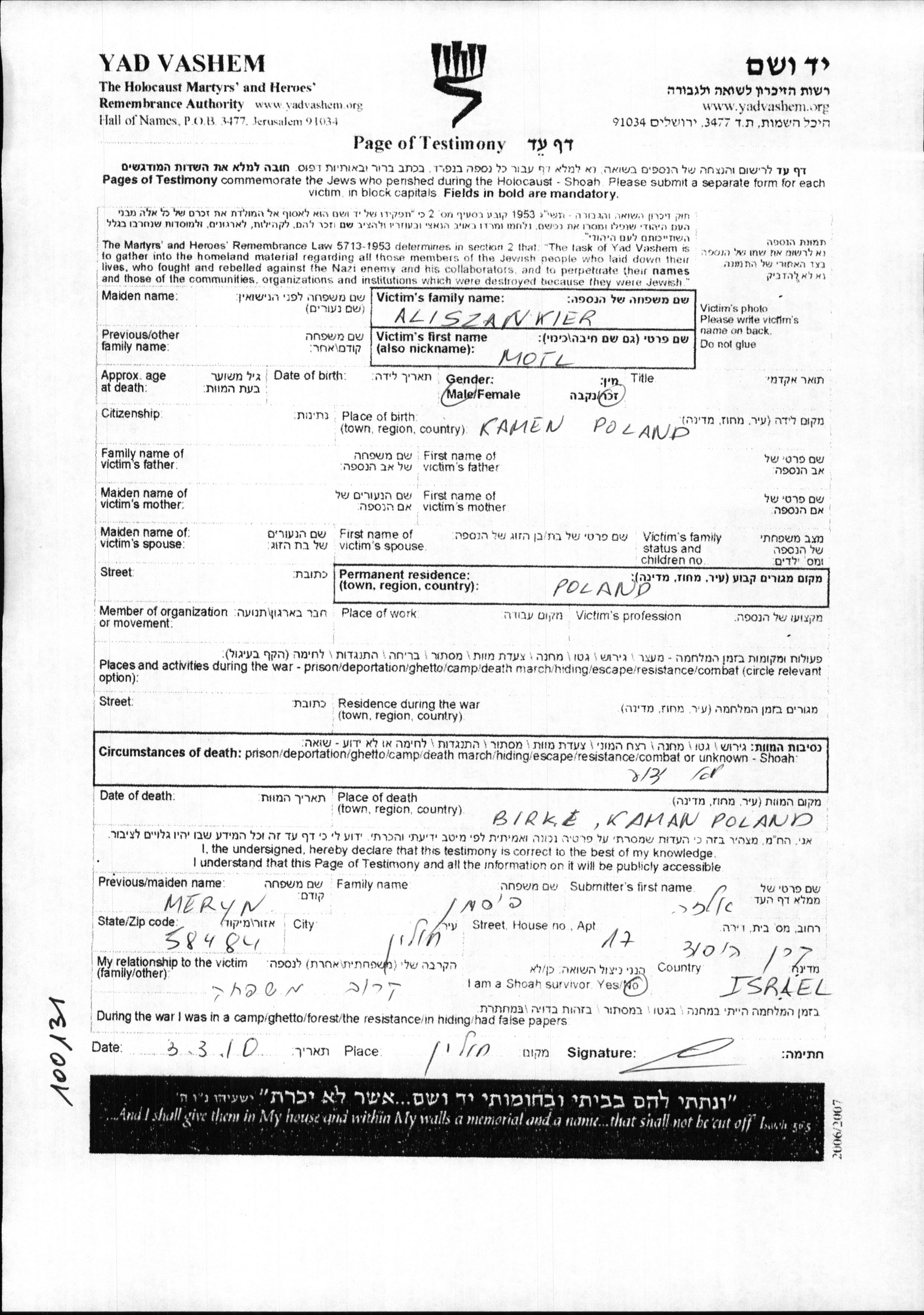 Matl Aliszankier was born in Kamien, Poland. Prior to WWII he lived in Kamien, Poland. During the war he was in Kamien, Poland. Matl was murdered in the Shoah. Place of death: Birke Kamen, Poland.