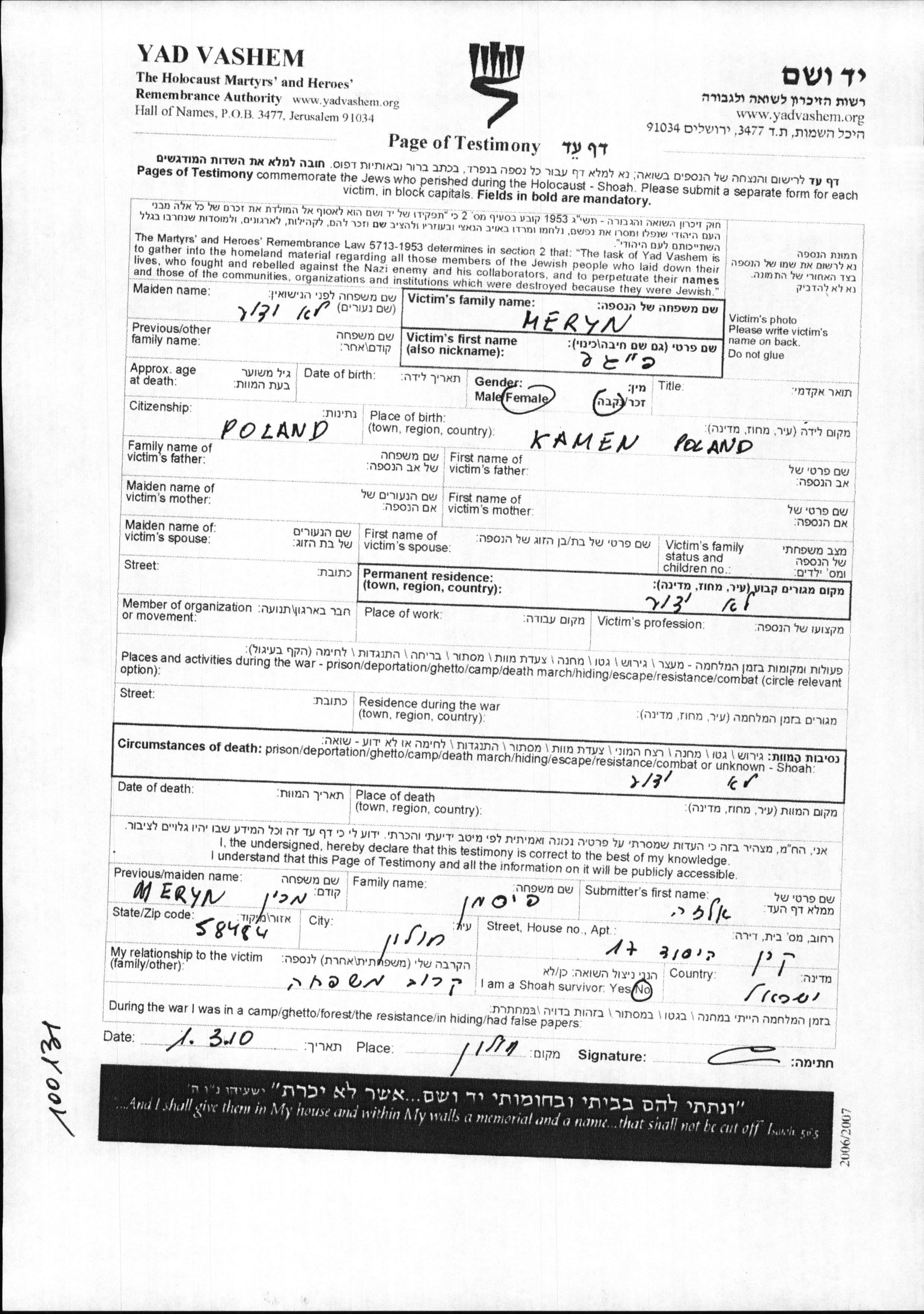 Yad Vashem - Pages of Testimony Names Memorial Collection
