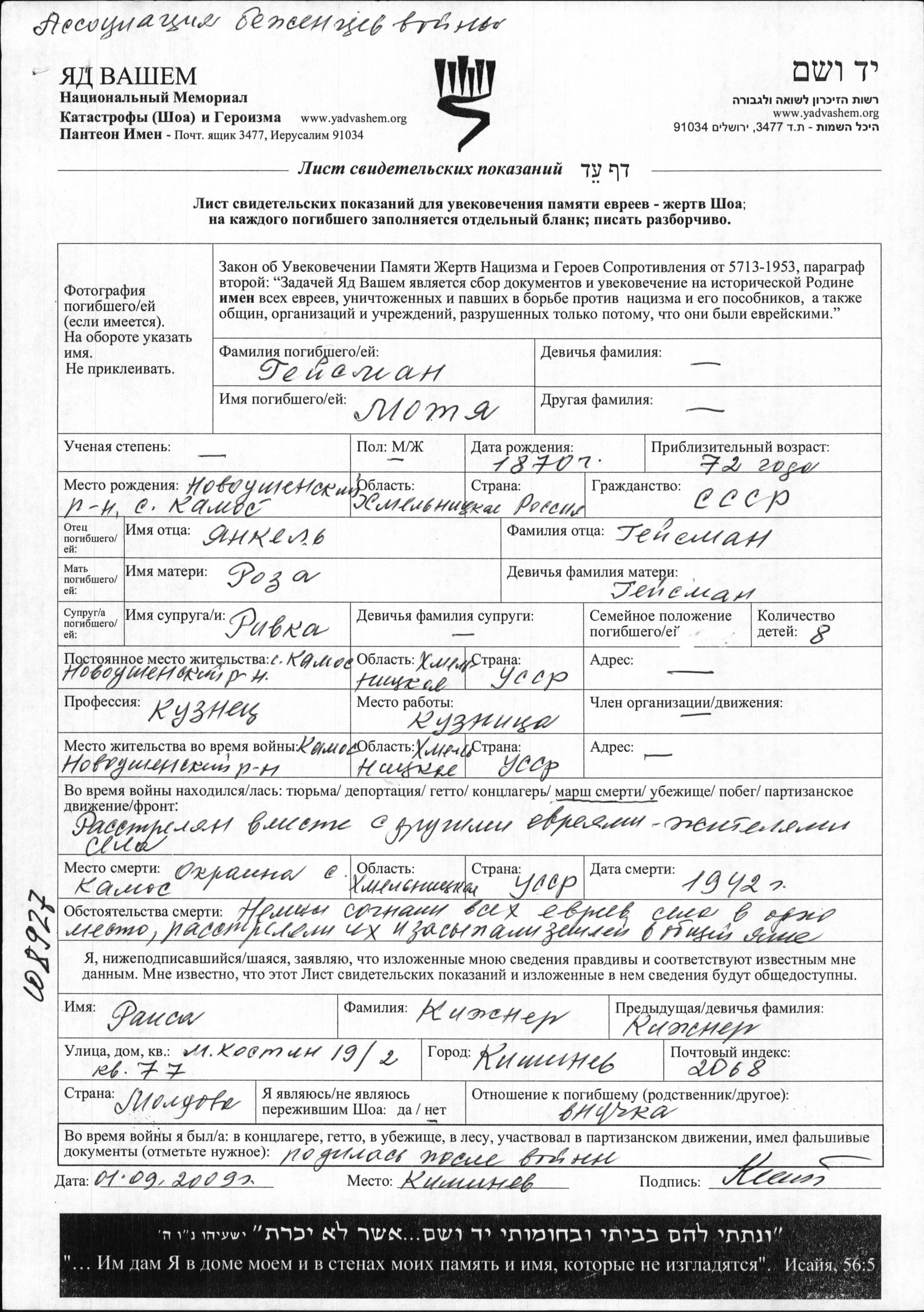 Motya Geysman was born in Kalyus, Ukraine (USSR), 1870 to Yankel and Roza. He was a blacksmith and married to Rivka. Prior to WWII he lived in Kalyus, Ukraine (USSR). During the war he was in Kalyus, Ukraine (USSR). Motya was murdered in the Shoah. Place of death: Kalyus, Ukraine (USSR), 1942.
