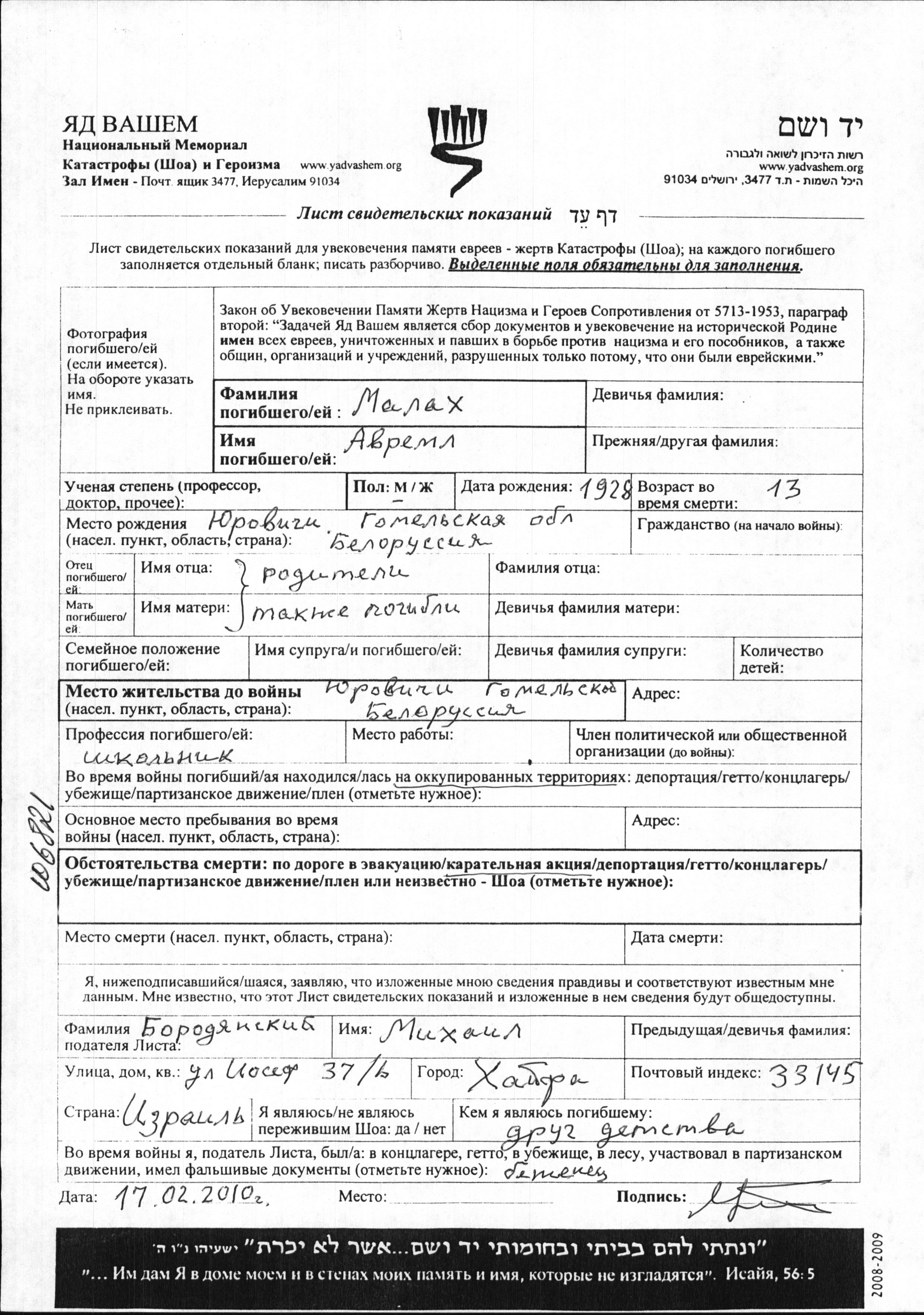 Malakh Avreml 1928 Yurovichi, Belorussia (USSR) Page of Testimony