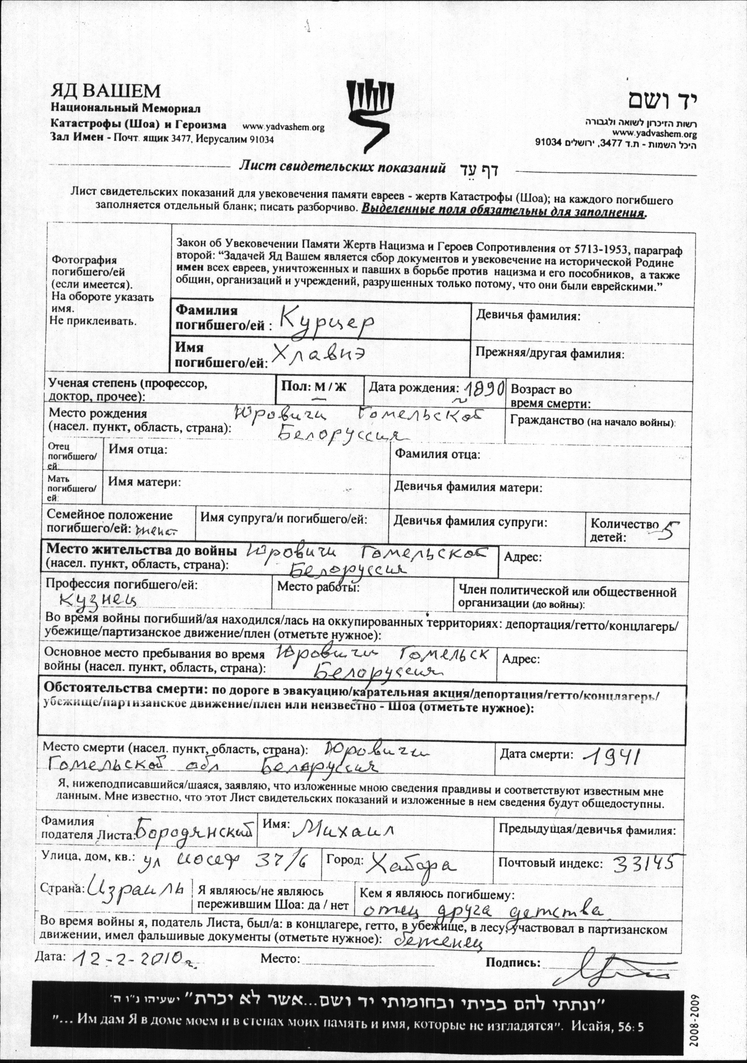 Kurtzer Khlavne 1890 Yurovichi, Belorussia (USSR) Page of Testimony