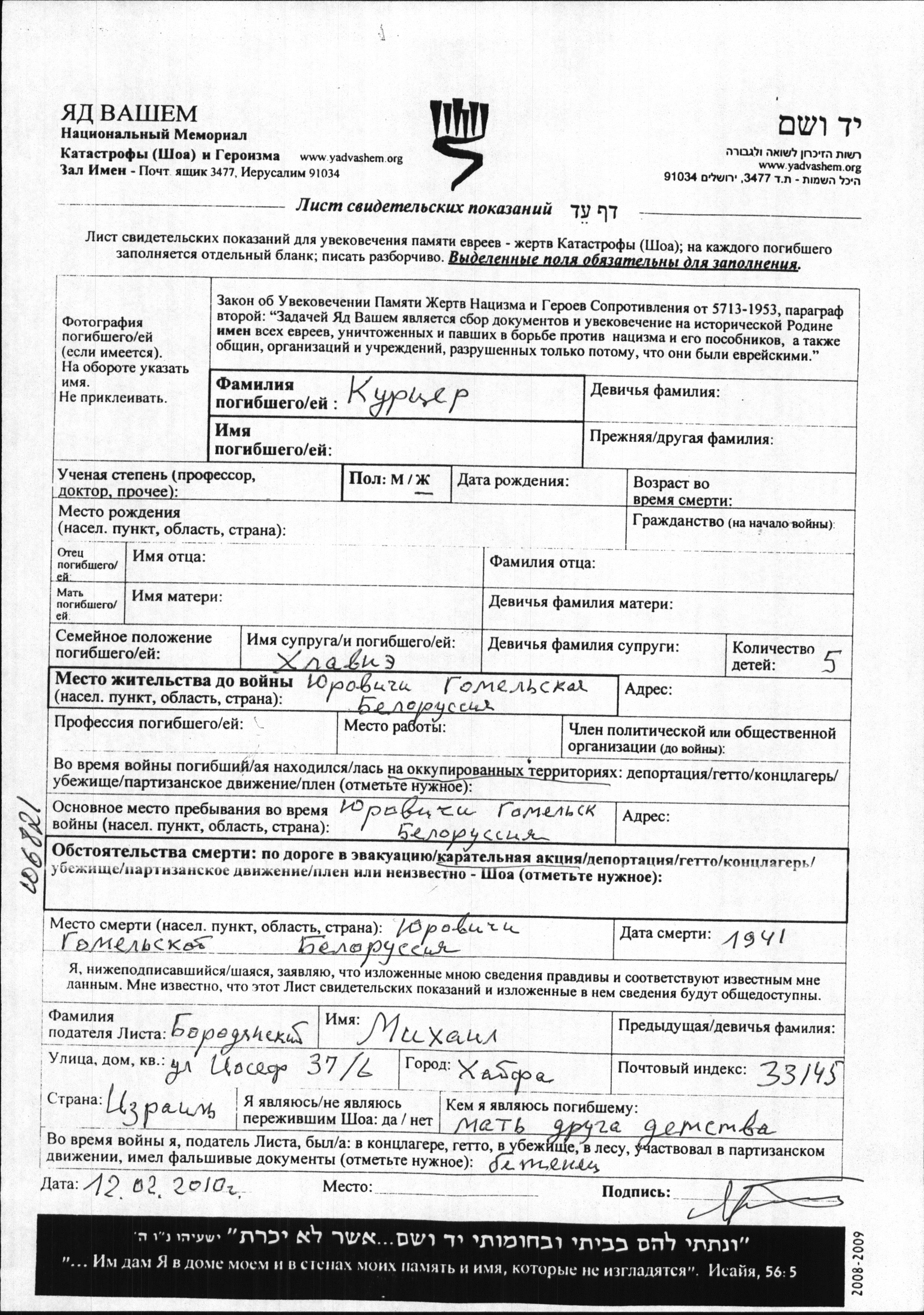 Kurtzer First name unknown Yurovichi, Belorussia (USSR) Page of Testimony