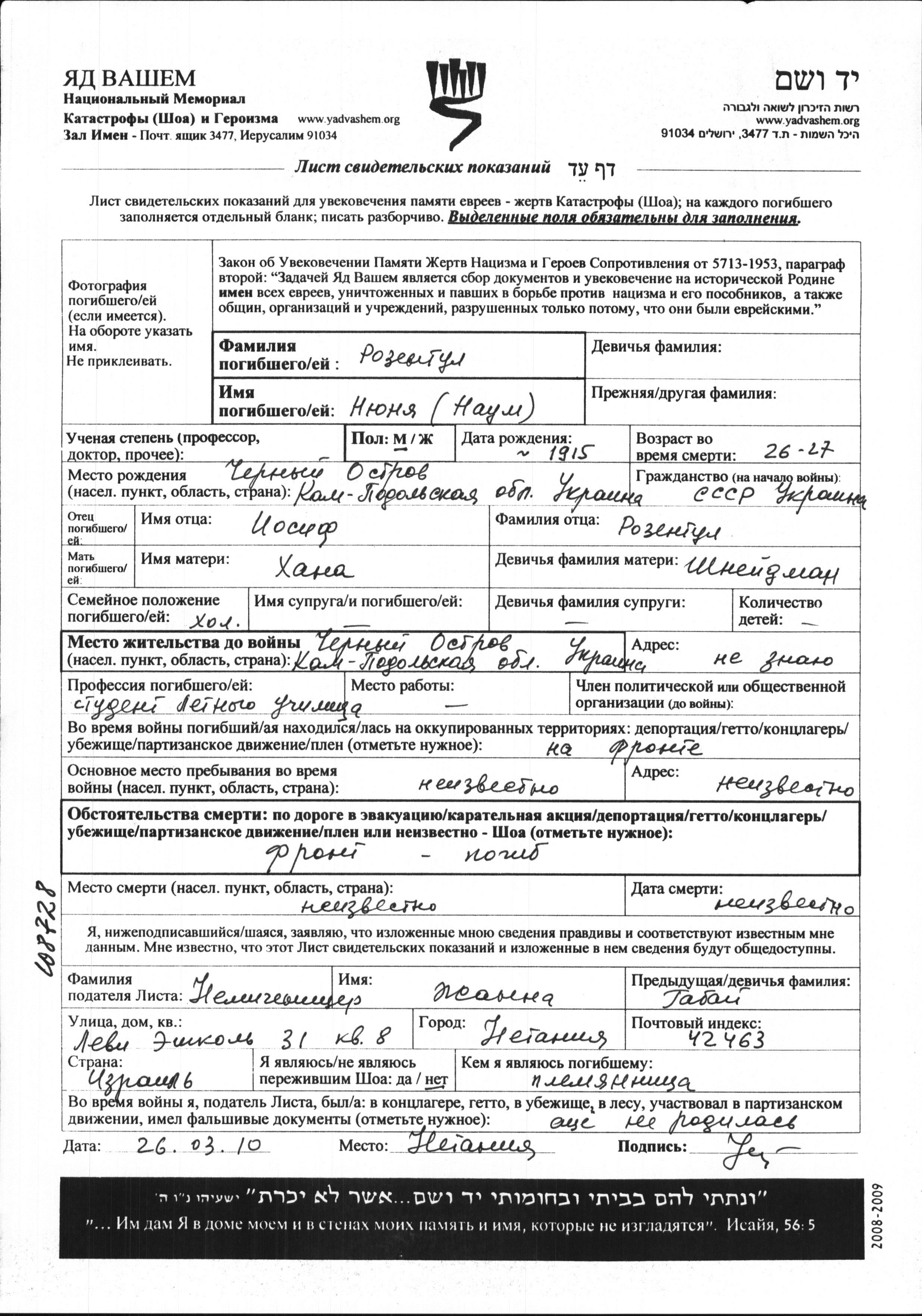 Nyunya Naum Rozentul was born in Cherny Ostrov, Ukraine (USSR), 1915 to Iosif and Khana nee Shneydman. He was a kursant lyotnogo uchilishcha russian and single. Prior to WWII he lived in Cherny Ostrov, Ukraine (USSR). During the war he was in the Soviet armed forces. Nyunya Naum was killed in military service in WWII.