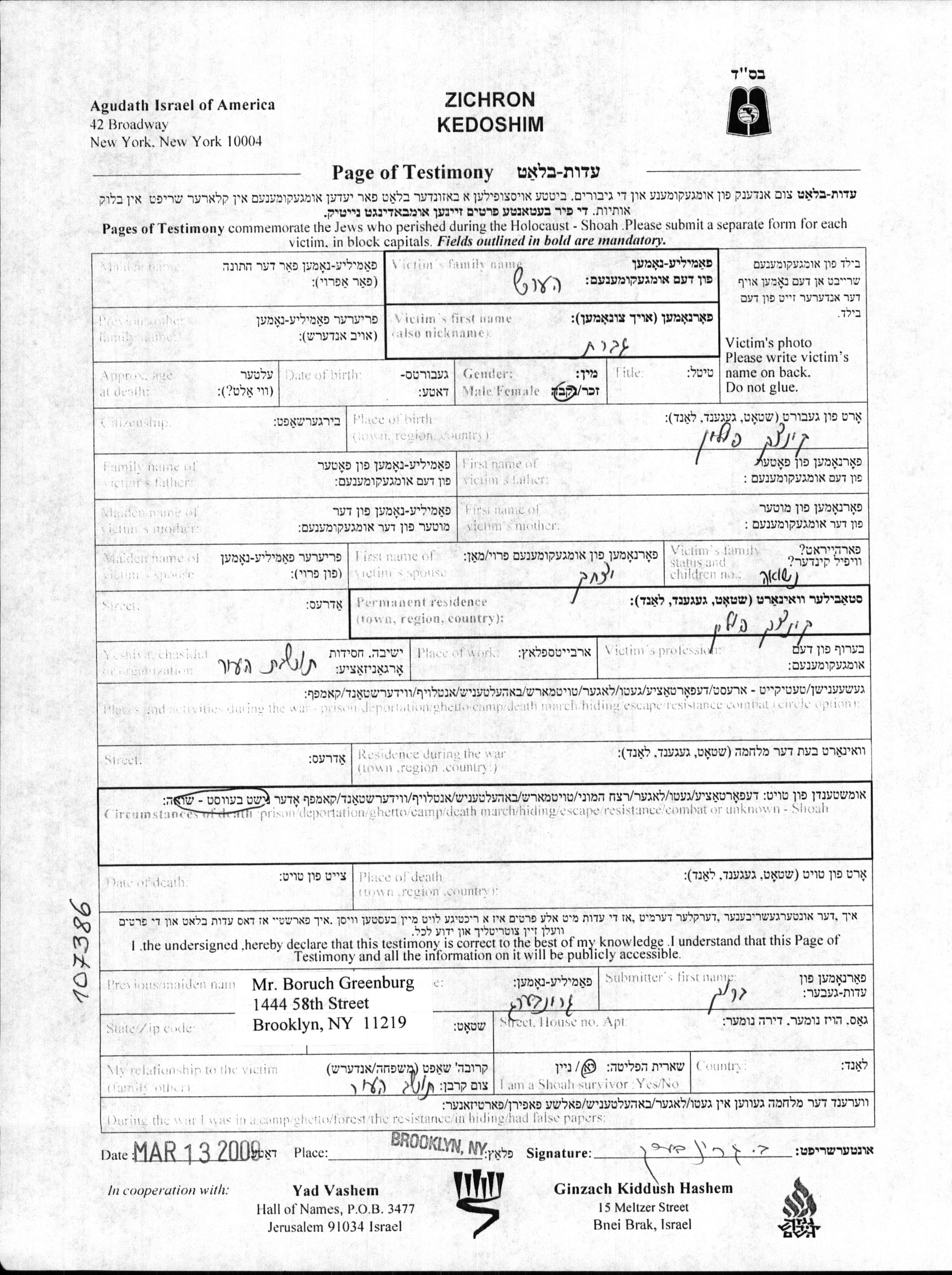 Yad Vashem - Pages of Testimony Names Memorial Collection