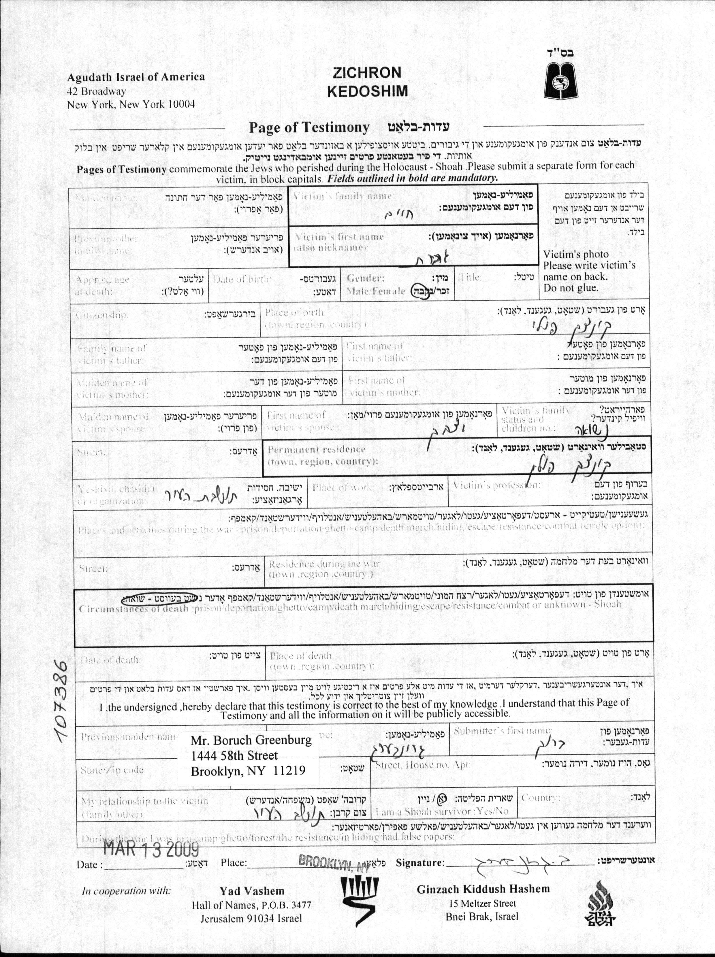 Yad Vashem - Pages of Testimony Names Memorial Collection