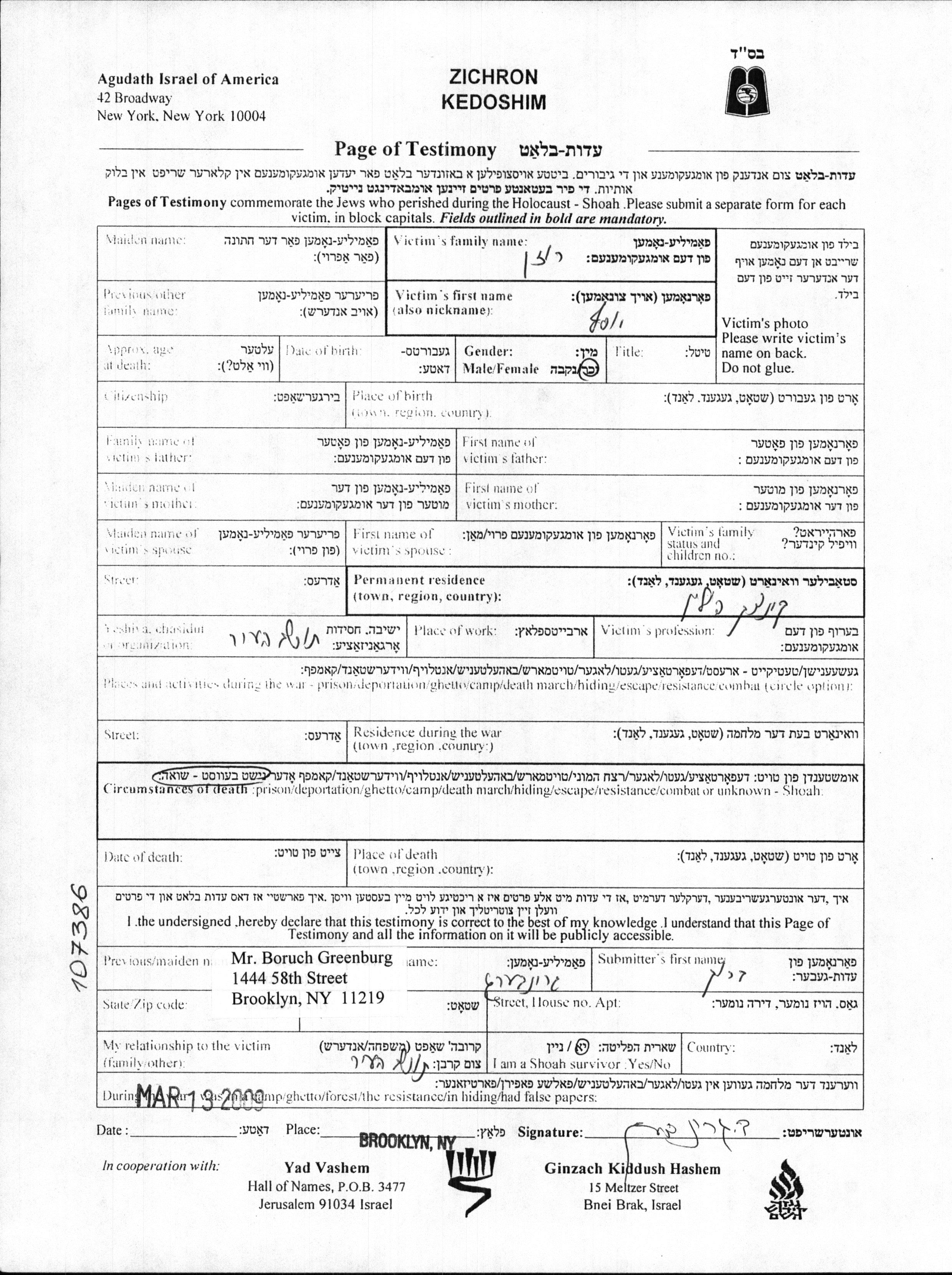 Yad Vashem - Pages of Testimony Names Memorial Collection