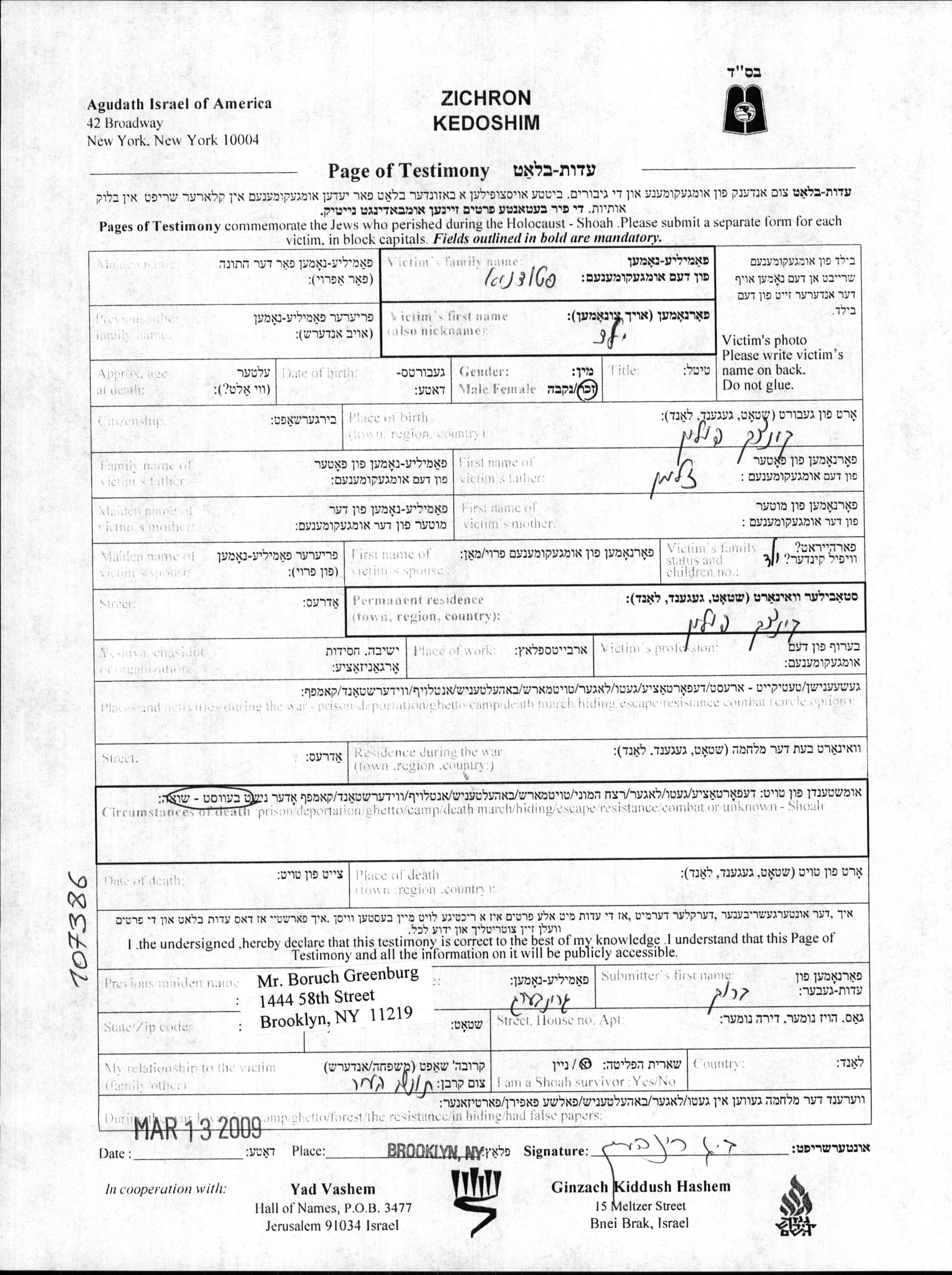 Yad Vashem - Pages of Testimony Names Memorial Collection