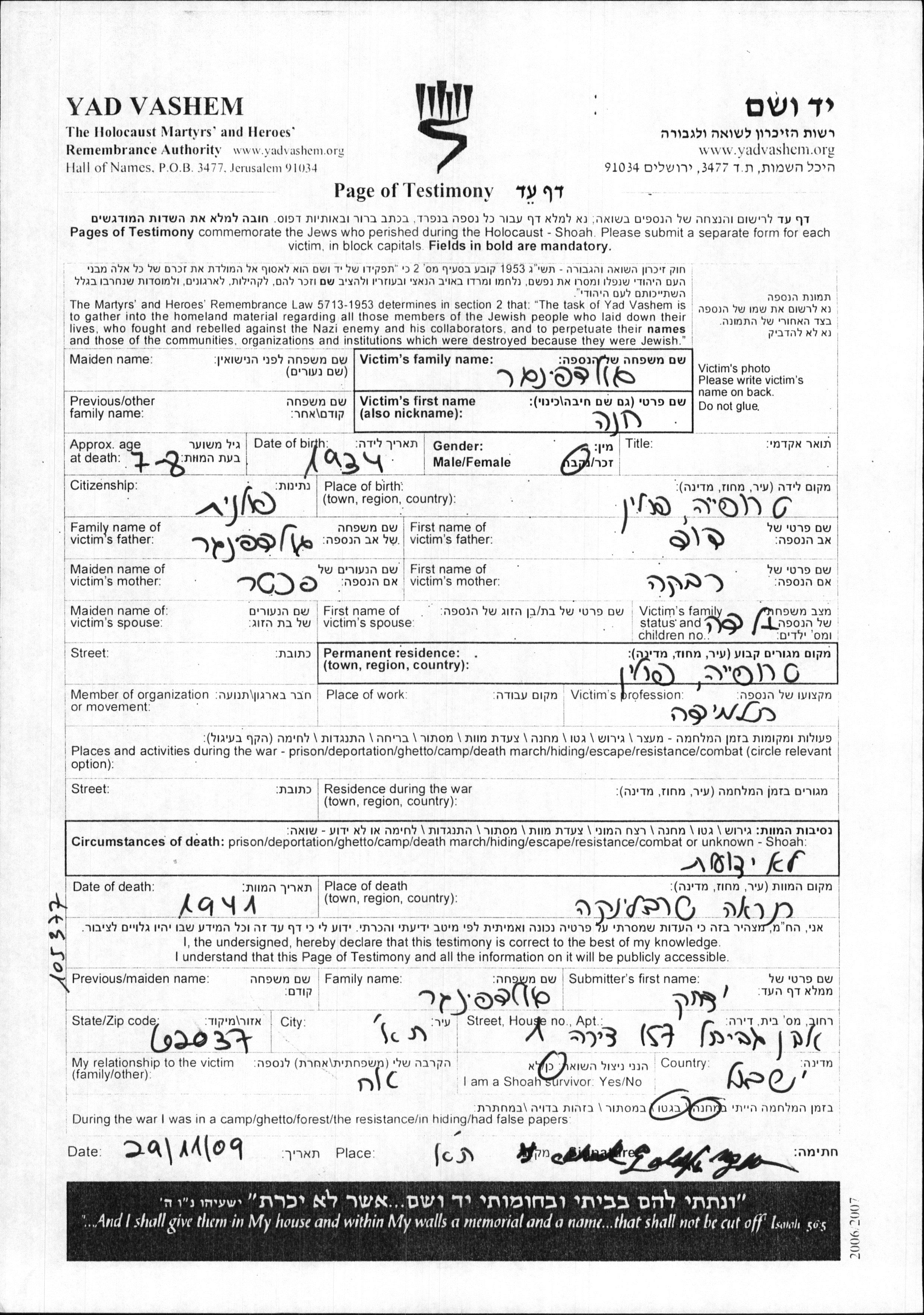 Chana Goldfinger was born in Tropie, Poland, 1934 to David and Rivka nee Pekhter. She was a pupil and child. Prior to WWII she lived in Tropie, Poland. Chana was murdered in the Shoah. Place of death: Treblinka, Poland, 1941.