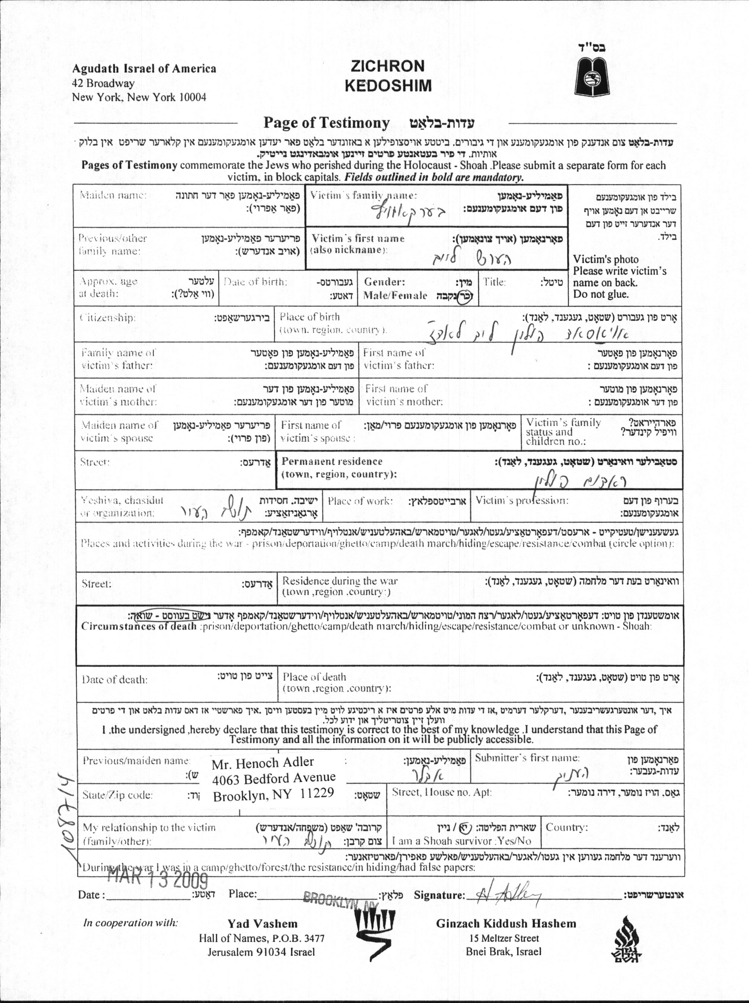 Yad Vashem - Pages of Testimony Names Memorial Collection