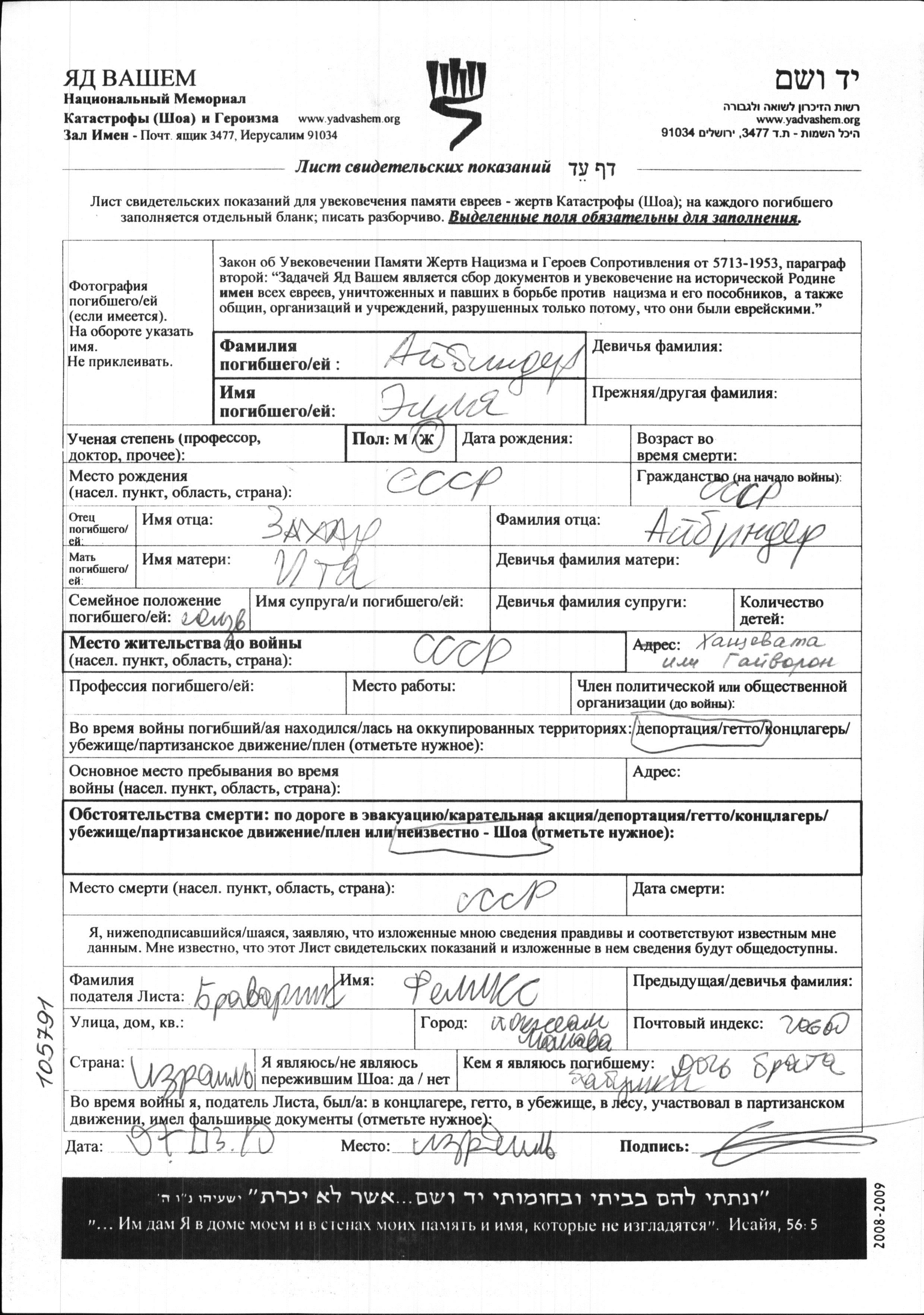 Ella Aibinder was born in Soviet Union to Zakhar and Ita. Prior to WWII she lived in Khashchevatoye, Ukraine (USSR). During the war she was in Soviet Union. Ella was murdered in the Shoah. Place of death: Soviet Union.