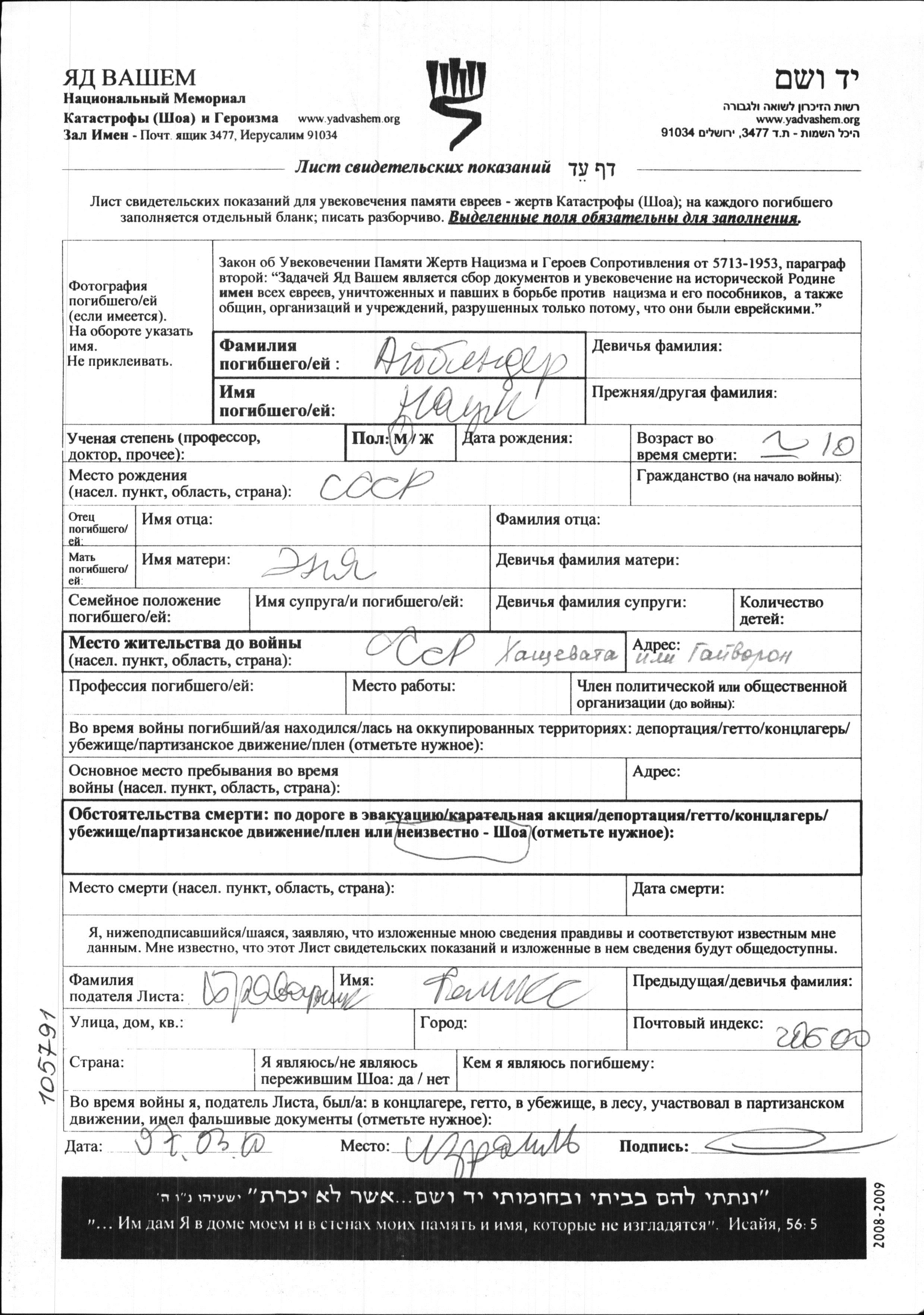 Yad Vashem - Pages of Testimony Names Memorial Collection