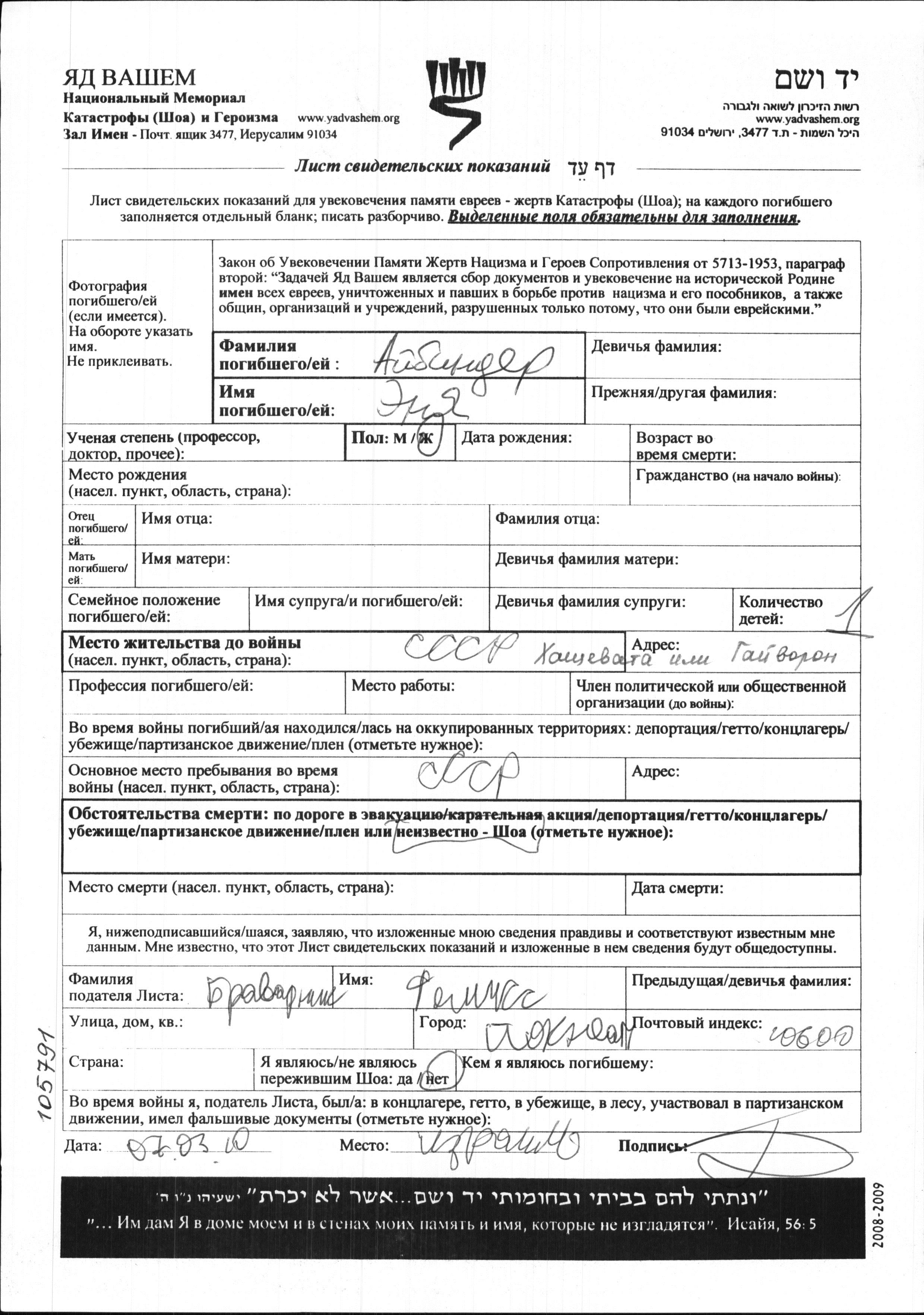 Aibinder Enya Khashchevatoye, Ukraine (USSR) Page of Testimony