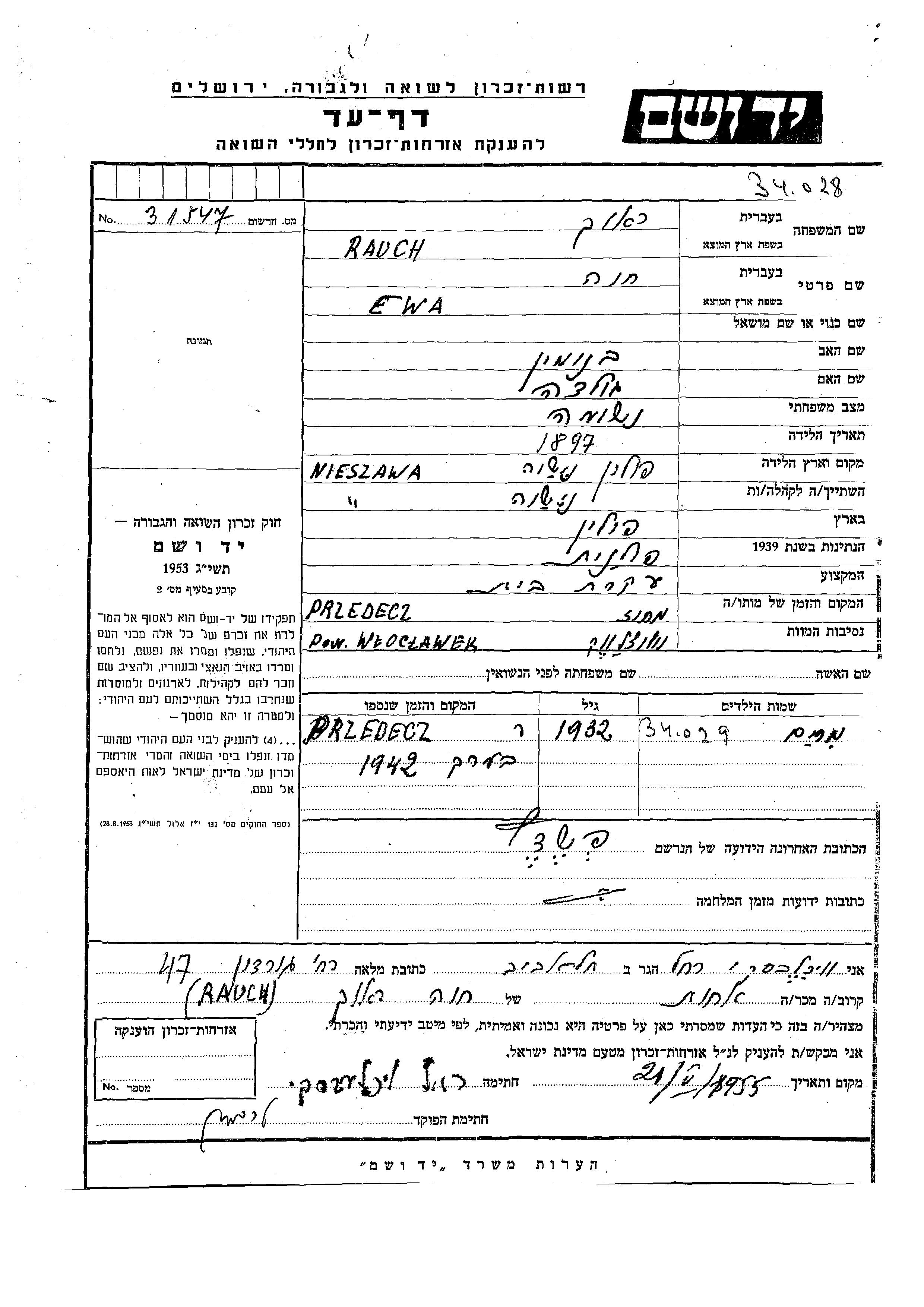 Ewa Khava Rauch was born in Nieszawa, Poland, 1897 to Beniamin and Golda. She was a housewife and married. Prior to WWII she lived in Przedecz, Poland. Ewa Khava was murdered in the Shoah. Place of death: Przedecz, Poland.