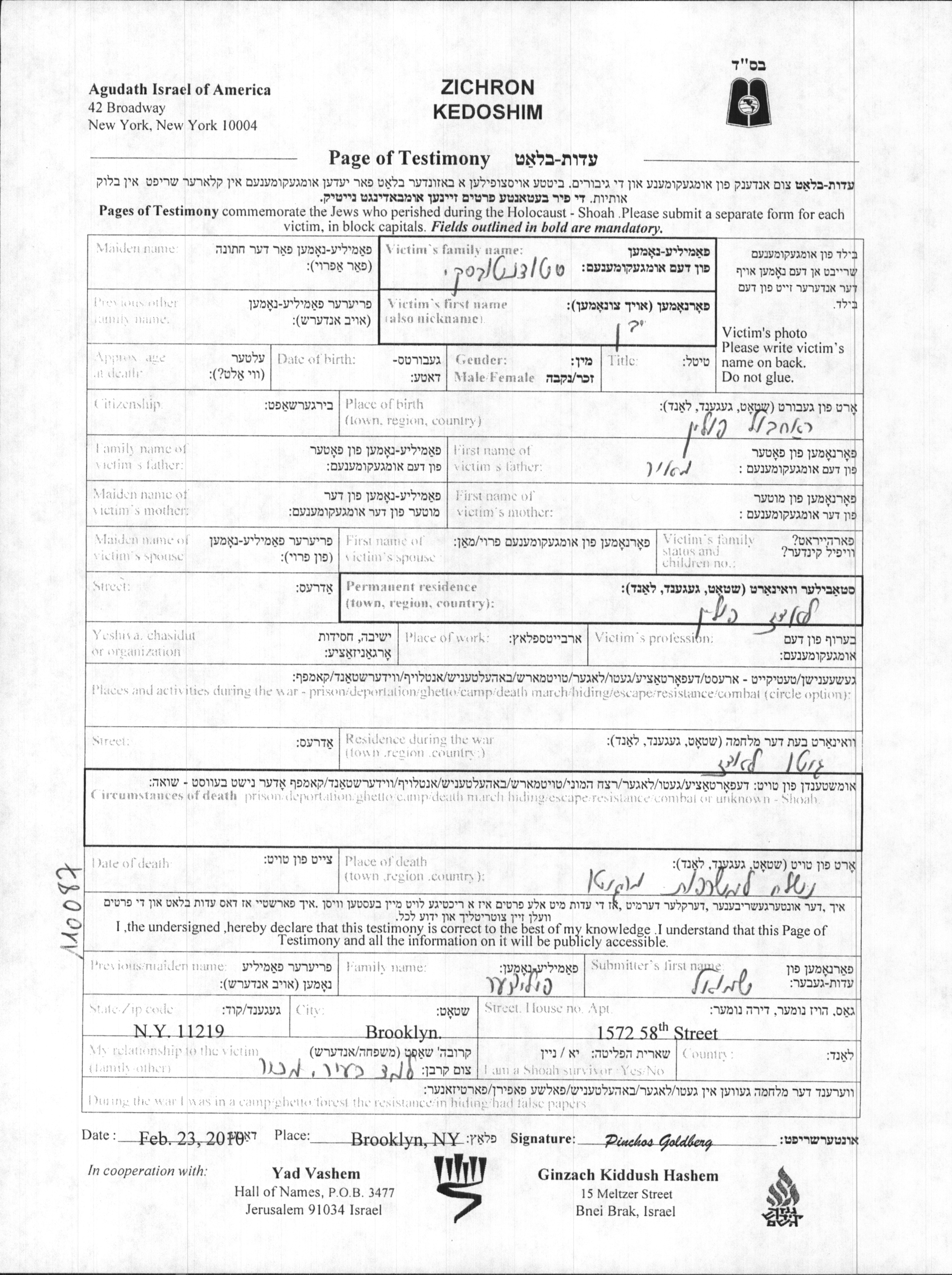 Yad Vashem - Pages of Testimony Names Memorial Collection