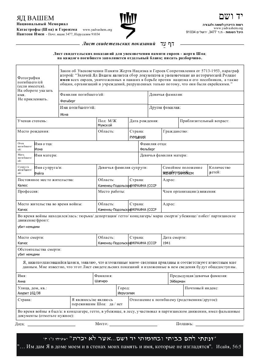 Iona Felberg was born in Romania to Iona. He was married to Feiga. Prior to WWII he lived in Kalyus, Ukraine (USSR). During the war he was in Kalyus, Ukraine (USSR). Iona was murdered in the Shoah. Place of death: Kalyus, Ukraine (USSR), 1941.