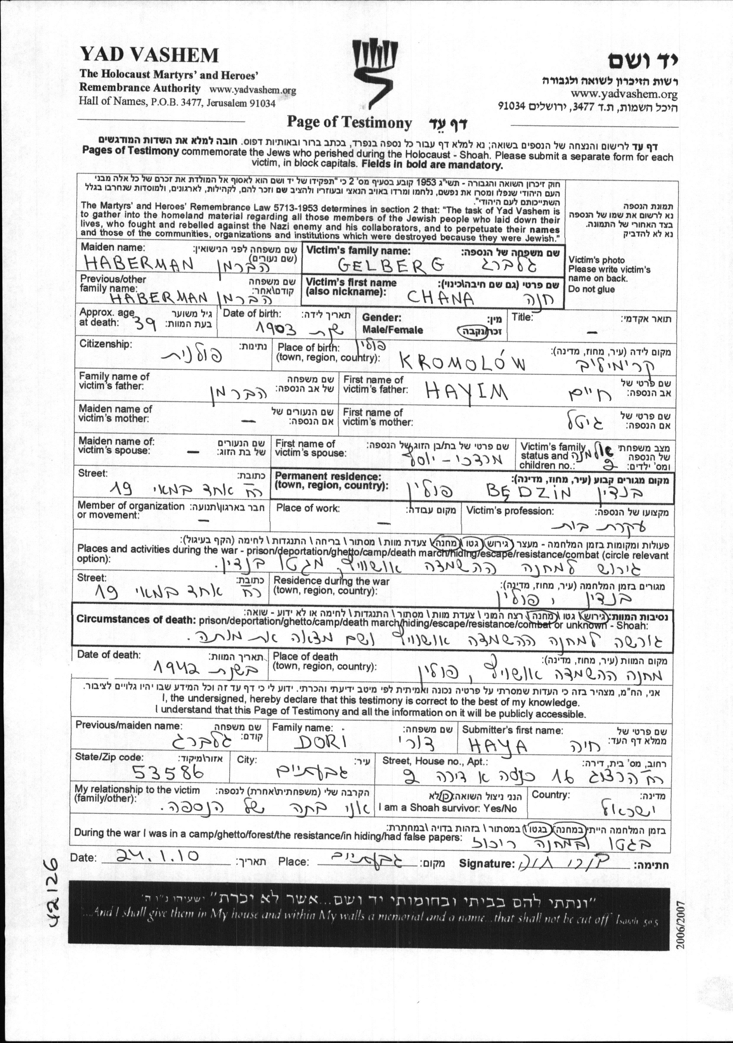 Chana Gelberg nee Haberman was born in Kromolow, Poland, 1903 to Chaim and Gitel. She was a housewife and a widowed Mordekhai Yosef. Prior to WWII she lived in Będzin, Poland. During the war she was in Będzin, Poland. Chana was murdered in the Shoah. Place of death: Auschwitz, Poland, 1942.