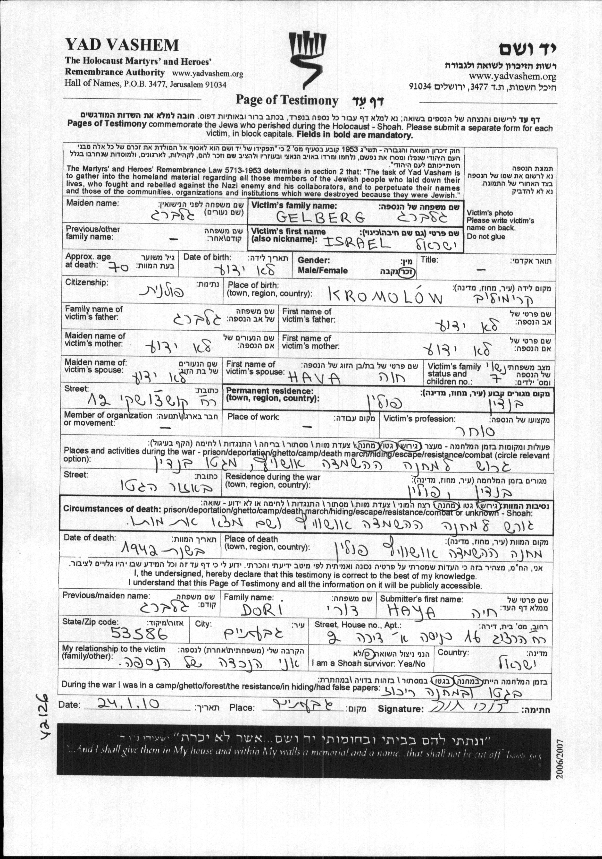 Israel Gelberg was born in Kromolow, Poland. He was a merchant and married to Hava. Prior to WWII he lived in Będzin, Poland. During the war he was in Będzin, Poland. Israel was murdered in the Shoah. Place of death: Auschwitz, Poland, 1942.