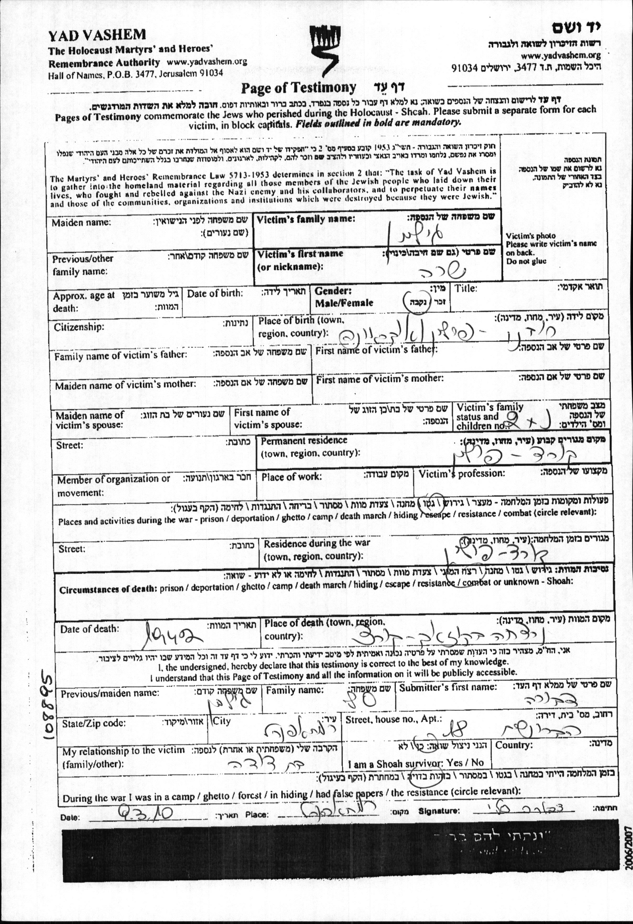 Yad Vashem - Pages of Testimony Names Memorial Collection