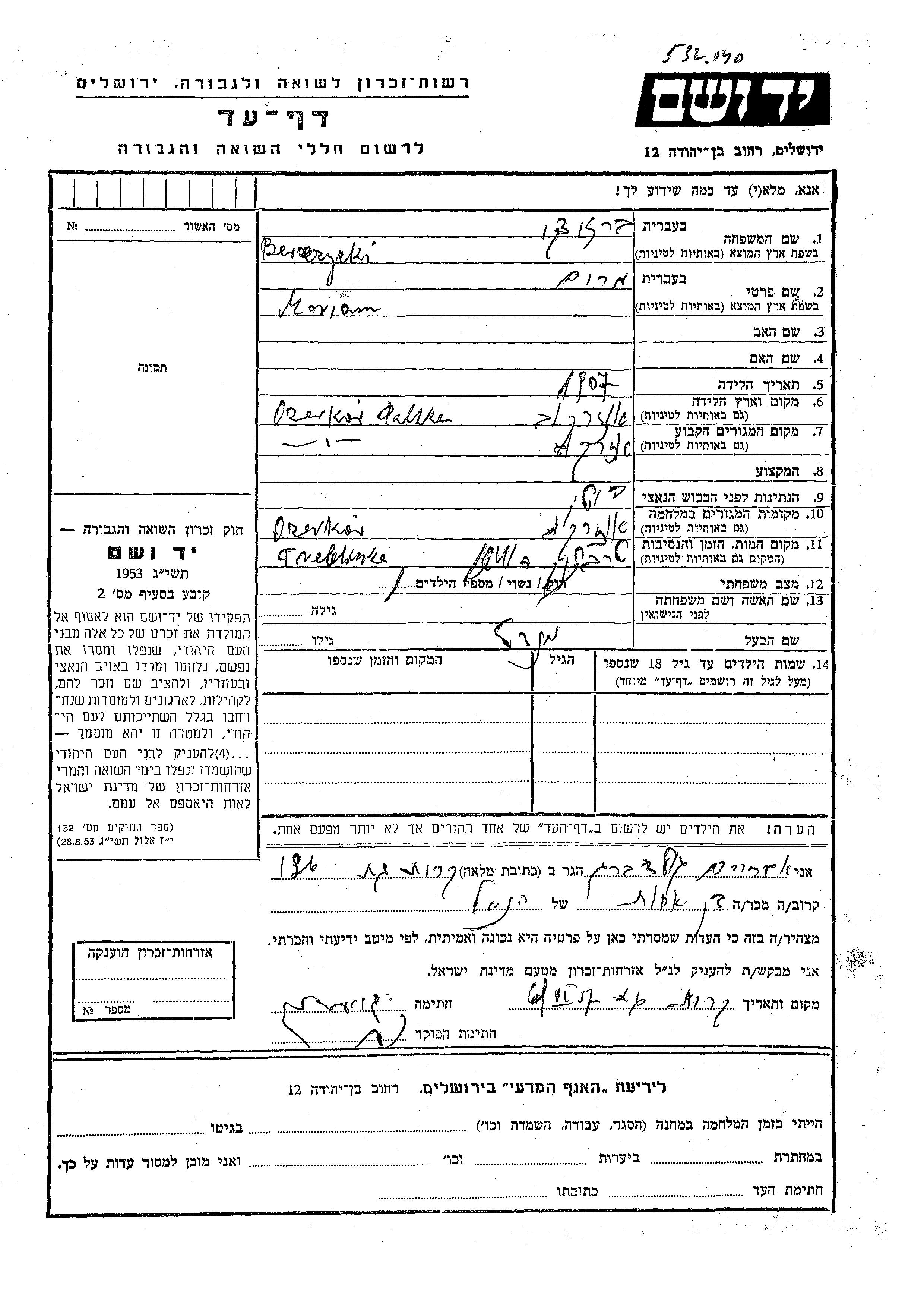Miriam Berzycki was born in Ozerkov, Poland, 1907. She was married to Mendel. Prior to WWII she lived in Ozerkov, Poland. During the war she was in Ozerkov, Poland. Miriam was murdered in the Shoah. Place of death: Treblinka, Poland, 1941.