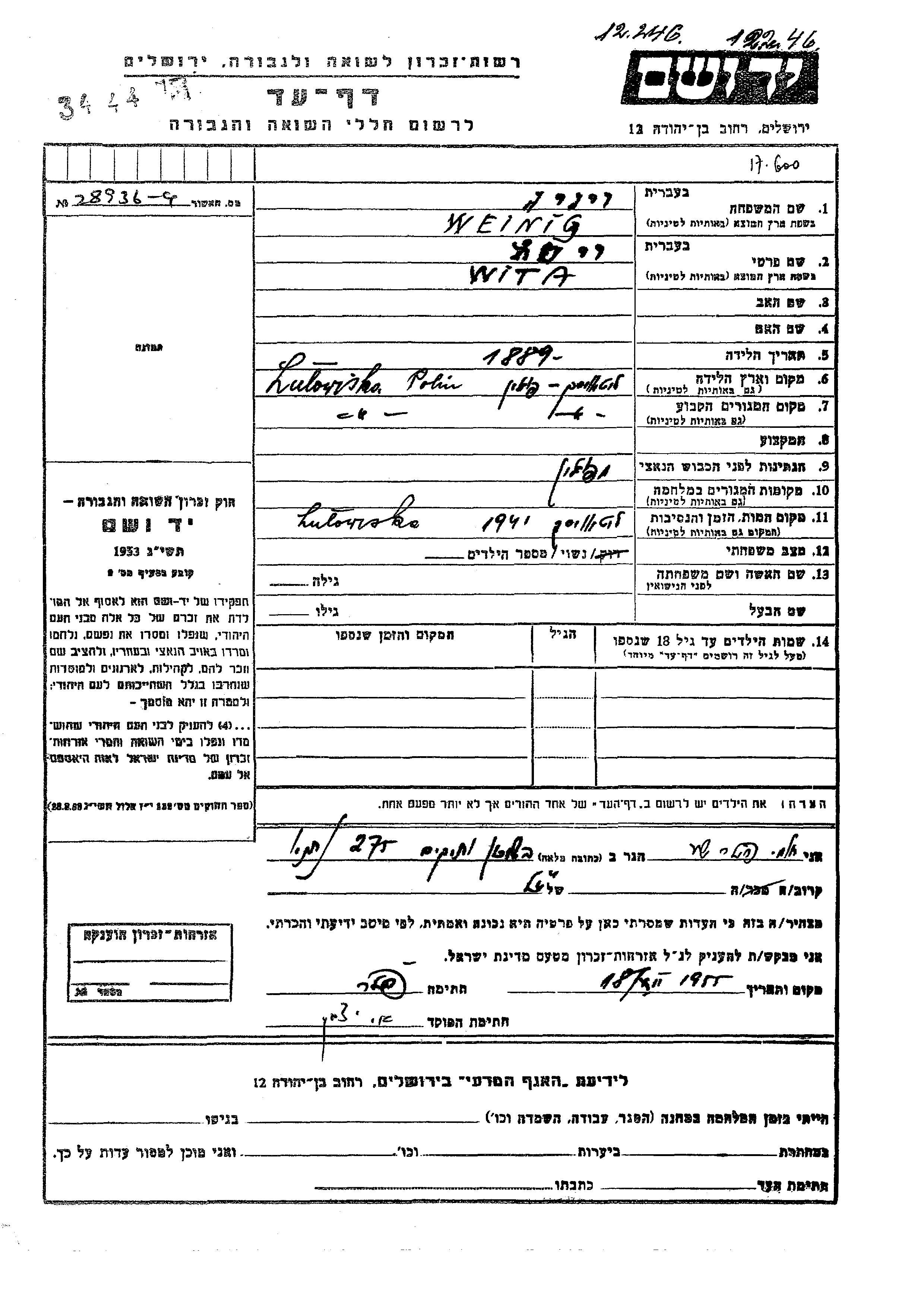 Wita Weinig Vinig was born in Lutowiska, Poland, 1889. She was single. Prior to WWII she lived in Lutowiska, Poland. Wita was murdered in the Shoah. Place of death: Lutowiska, Poland, 1941.