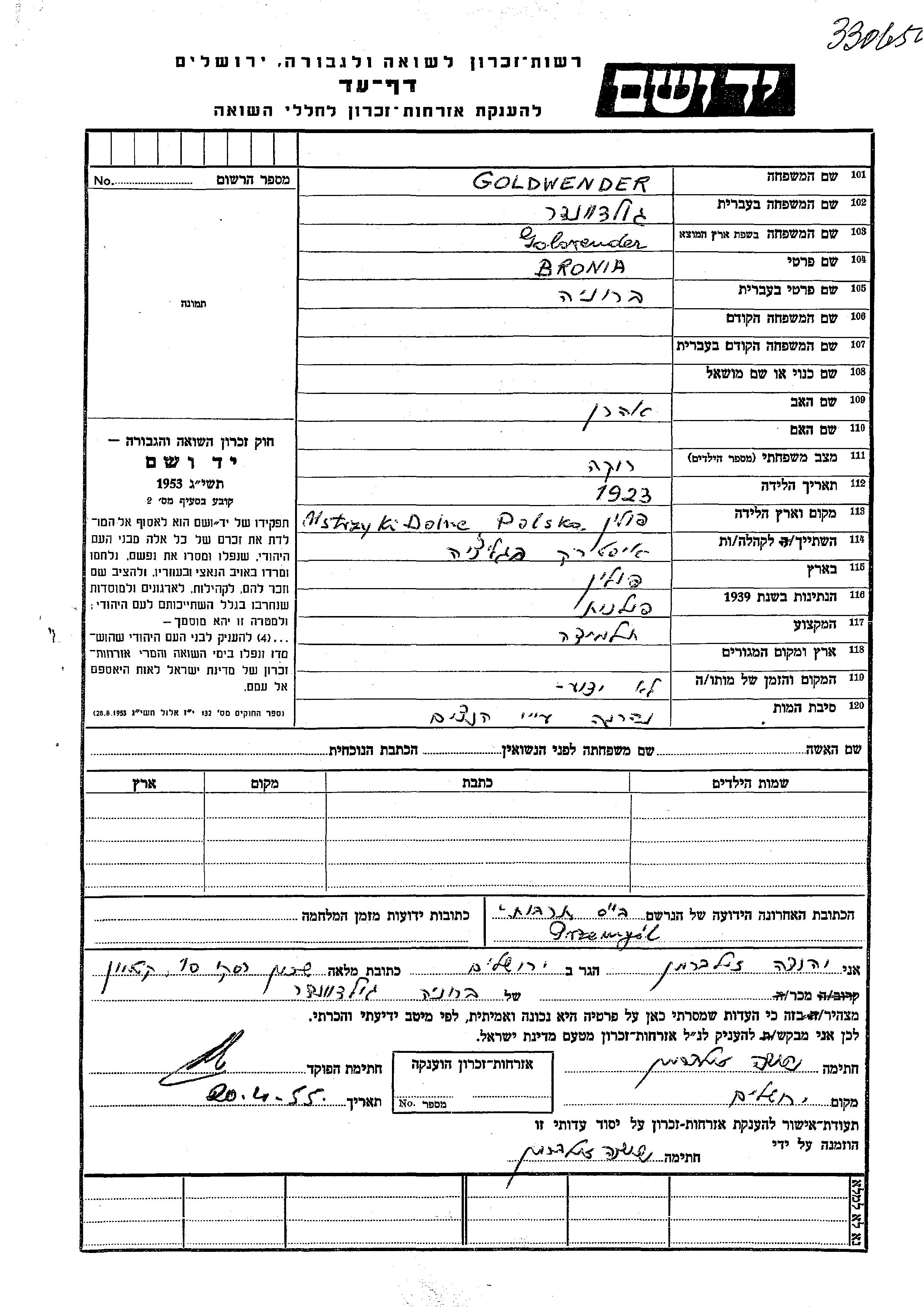 Bronia Goldwender was born in Ustrzyki Dolne, Poland, 1923 to Aharon. She was a pupil and single. Prior to WWII she lived in Ustrzyki Dolne, Poland. Bronia was murdered in the Shoah.