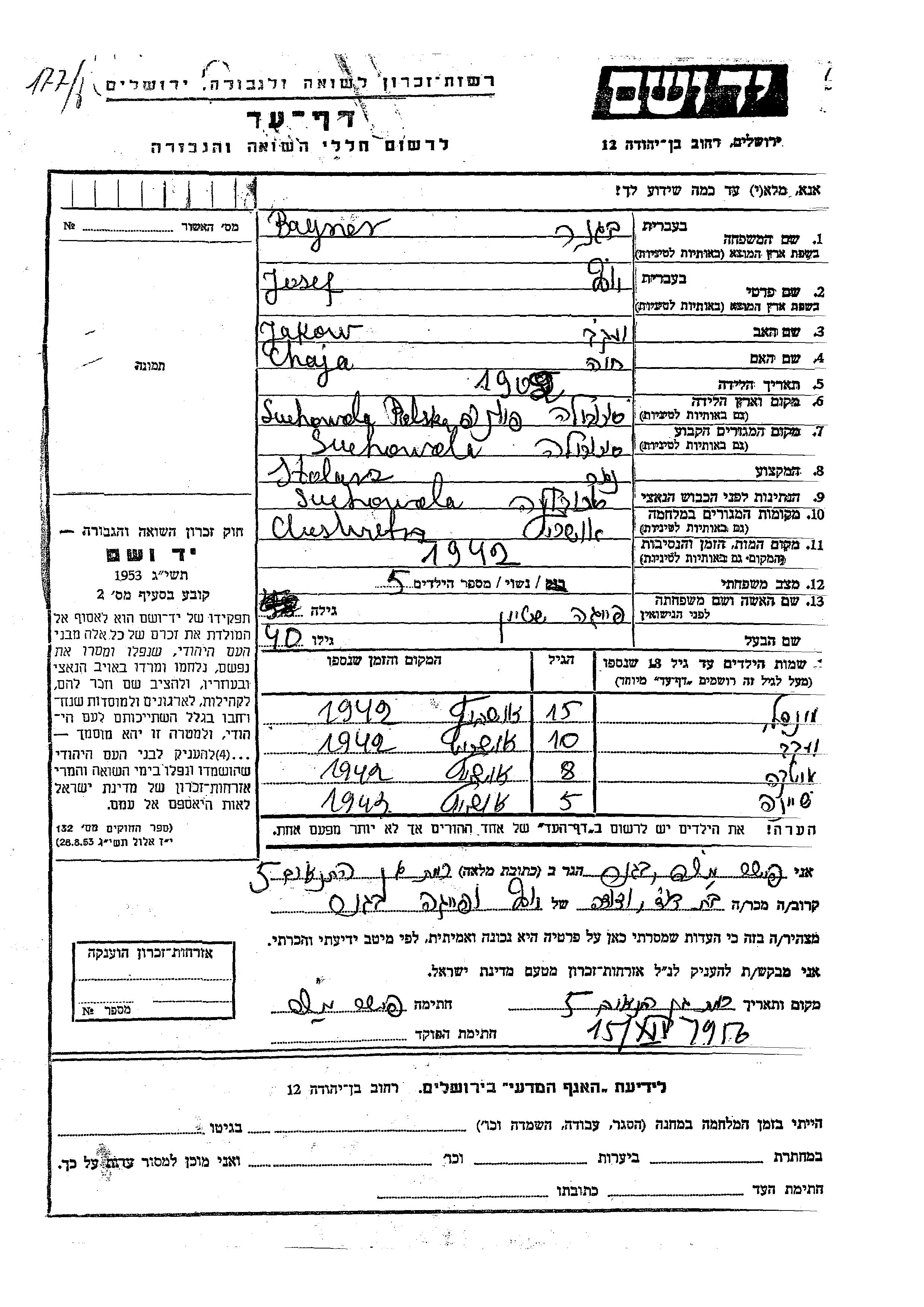 Josef Bagner was born in Suchowola, Poland, 1902 to Jakow and Chaja. He was a carpenter and married to Feiga nee Shtein. Prior to WWII he lived in Suchowola, Poland. During the war he was in Suchowola, Poland. Josef was murdered in the Shoah. Place of death: Auschwitz, Poland, 1942.