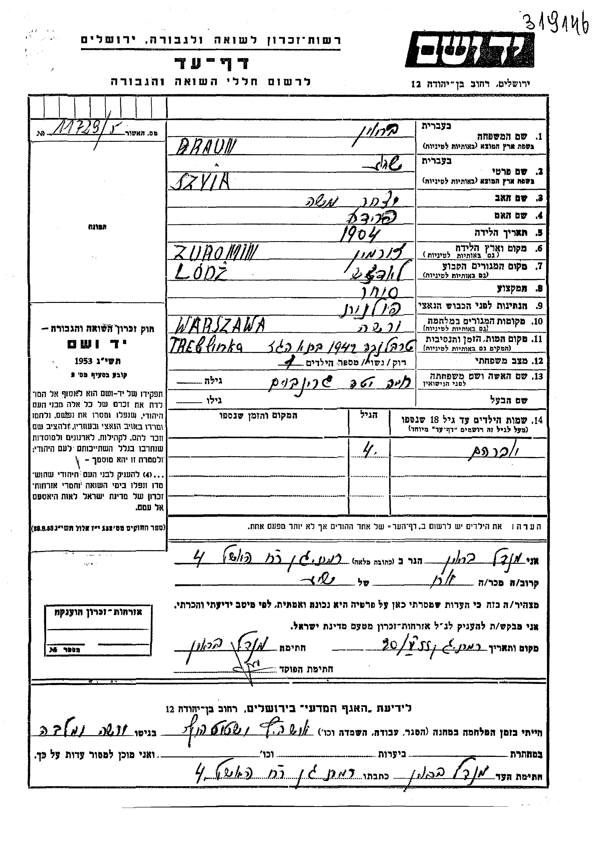 Szyia Shaie Braun was born in Zuromin, Poland, 1904 to Yitzkhak Moshe and Frida. He was a merchant and married to Khaia Yeta nee Grinboim. Prior to WWII he lived in Lodz, Poland. During the war he was in Warszawa, Poland. Szyia Shaie was murdered in the Shoah. Place of death: Treblinka, Poland, 1942.