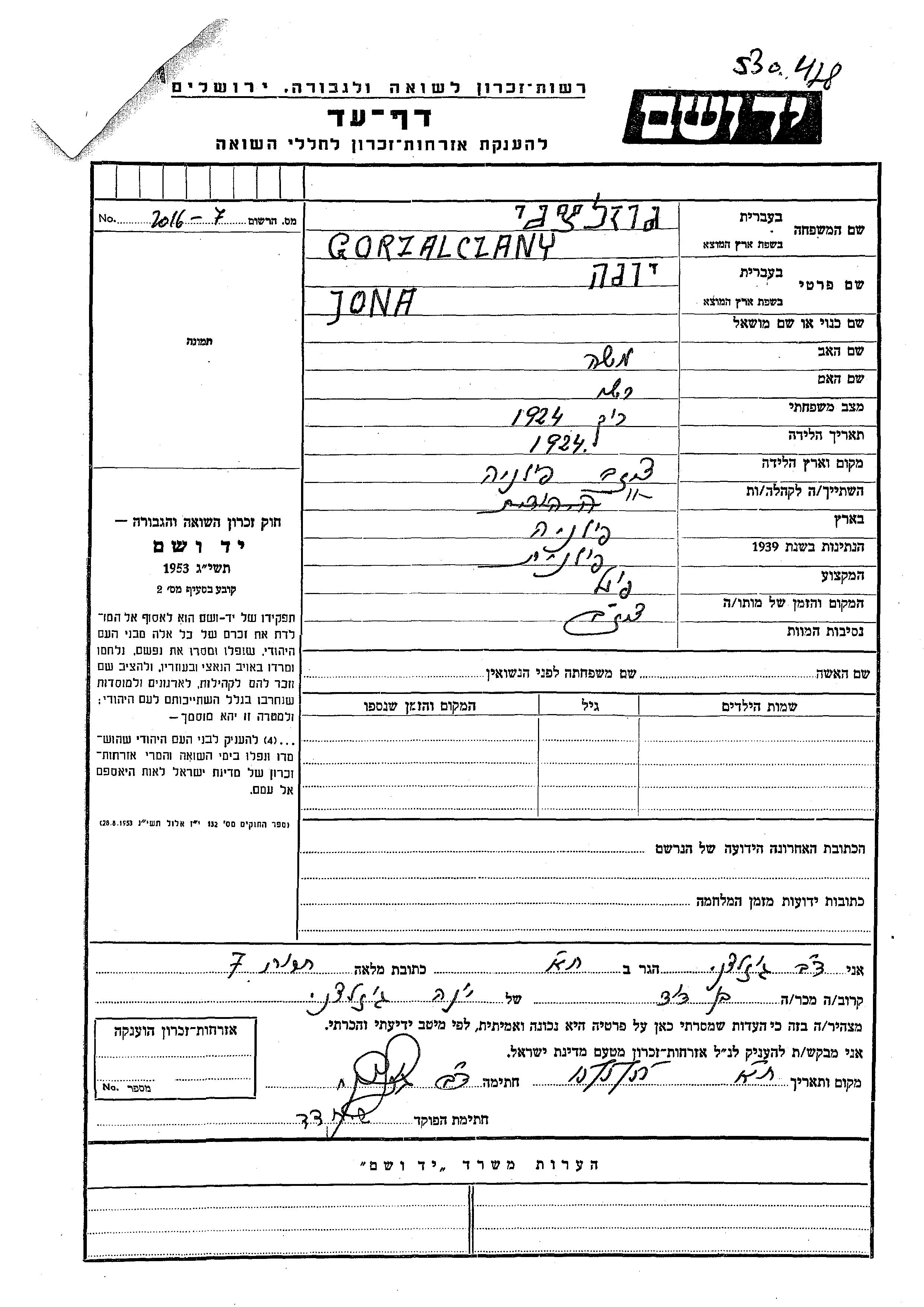 Yona Gorzalczany Gozhelani was born in Czyzew, Poland, 1924 to Moshe and Rasha. He was a worker. Prior to WWII he lived in Czyzew, Poland. Yona was murdered in the Shoah. Place of death: Czyzew, Poland.