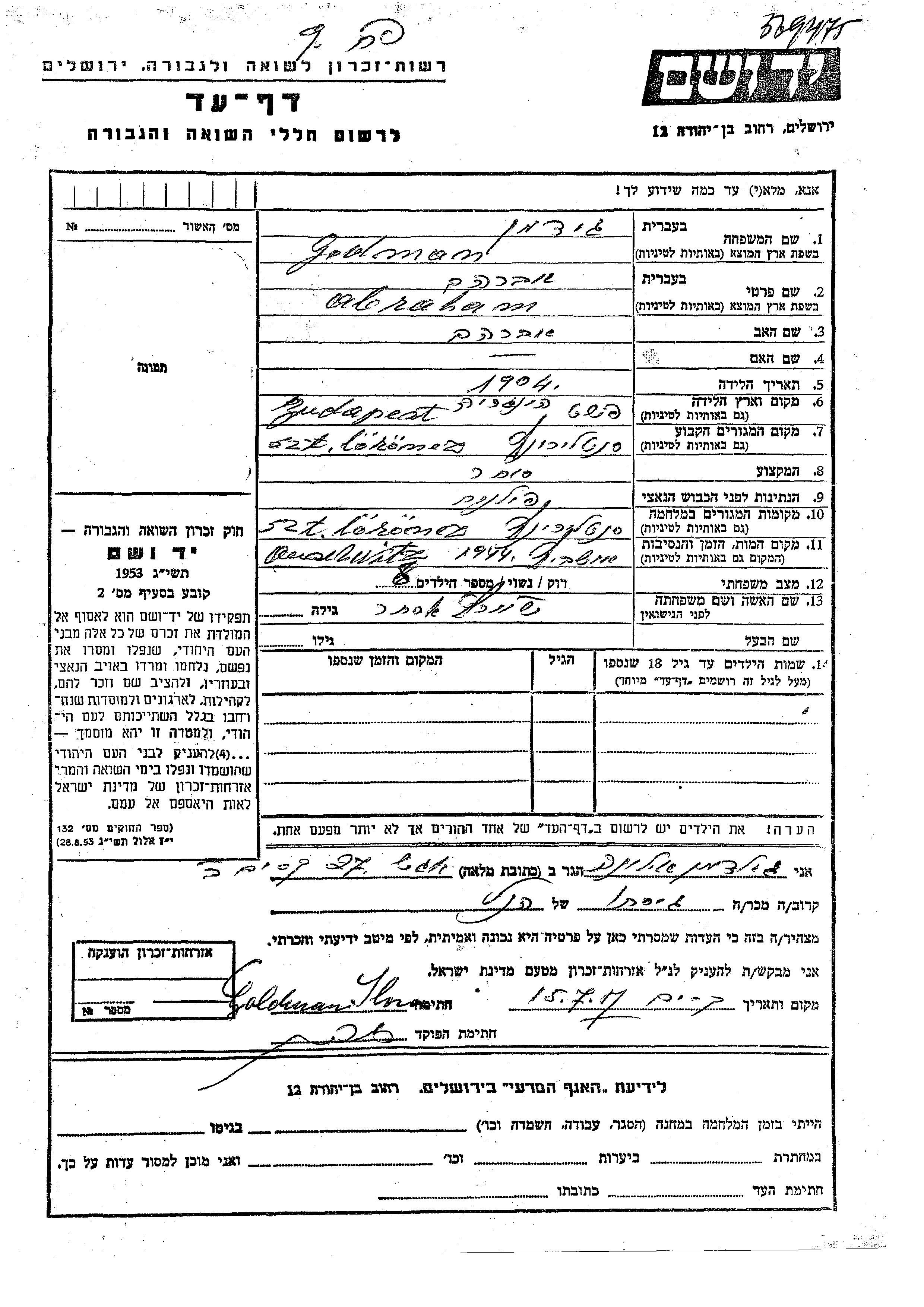 Godman Abraham 1904 Szentlorinc, Hungary Page of Testimony
