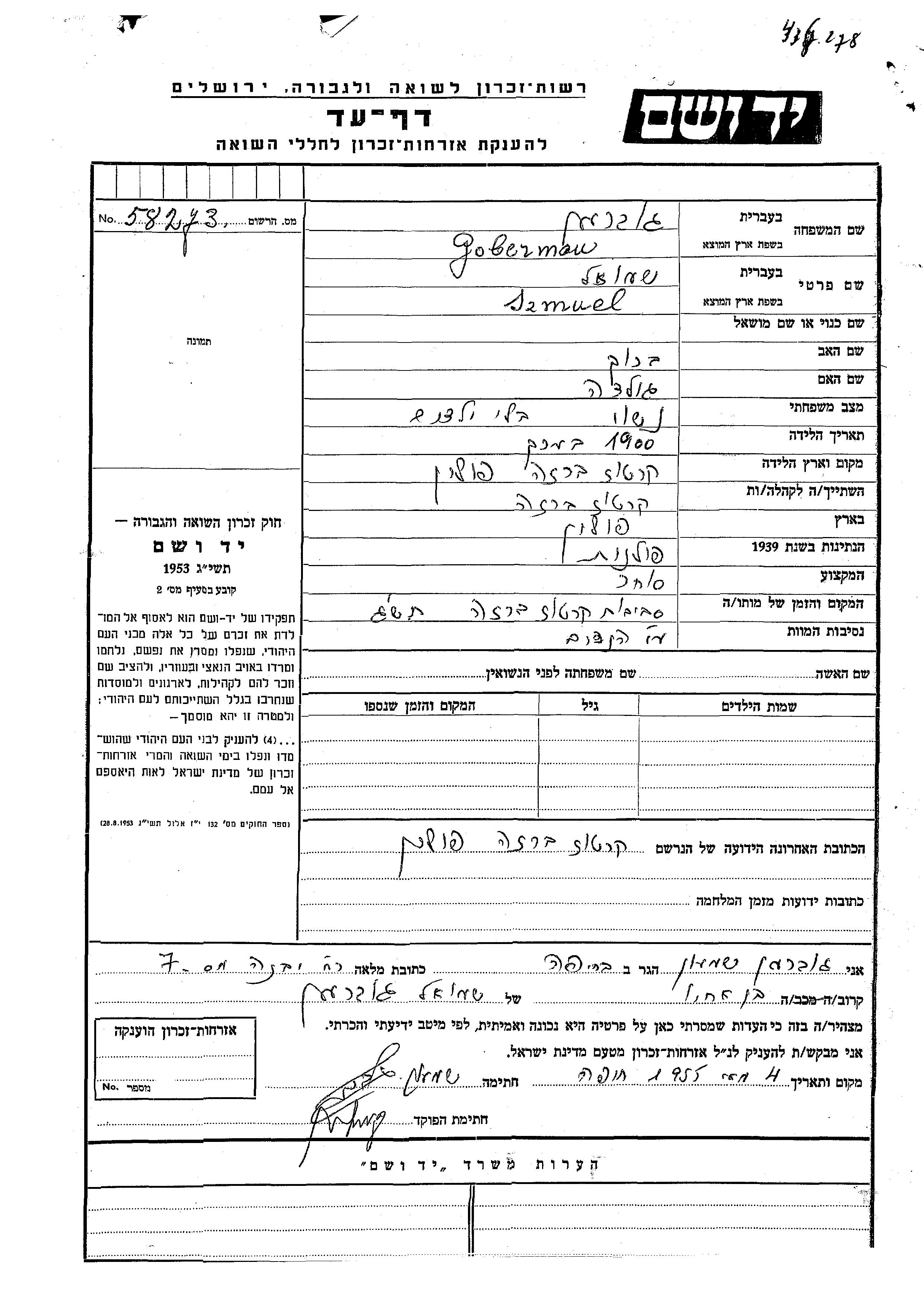 Szmuel Goberman was born in Kartuz Bereze, Poland, 1900 to Barukh and Golda. He was a merchant and married. Prior to WWII he lived in Kartuz Bereze, Poland. During the war he was in Kartuz Bereze, Poland. Szmuel was murdered in the Shoah. Place of death: Kartuz Bereze, Poland, 1943.