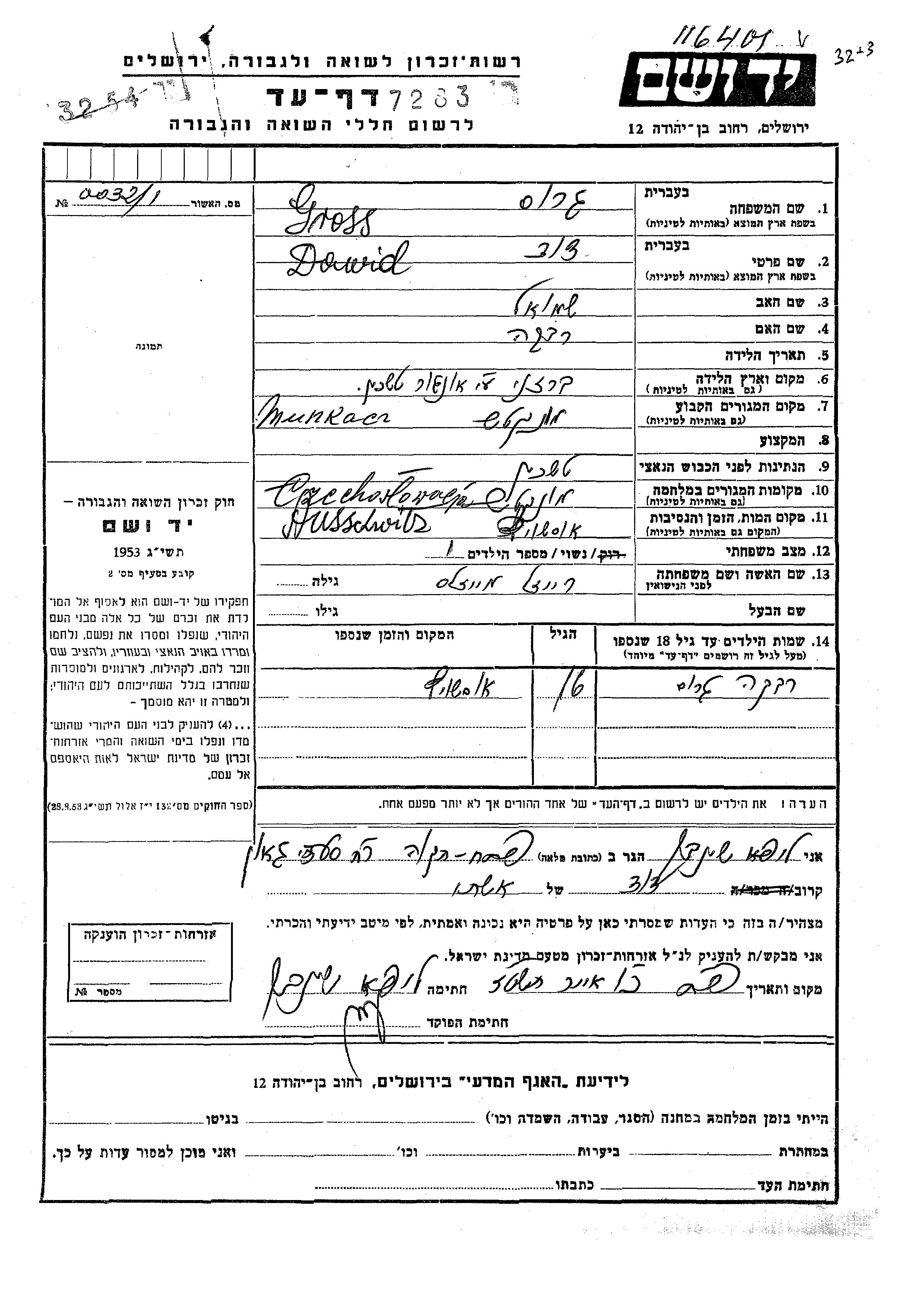 Dawid Gross was born in Berezne, Czechoslovakia to Shmuel and Beka. He was married to Reizl nee Meizels. Prior to WWII he lived in Munkacz, Czechoslovakia. During the war he was in Munkacz, Czechoslovakia. Dawid was murdered in the Shoah. Place of death: Auschwitz, Poland.